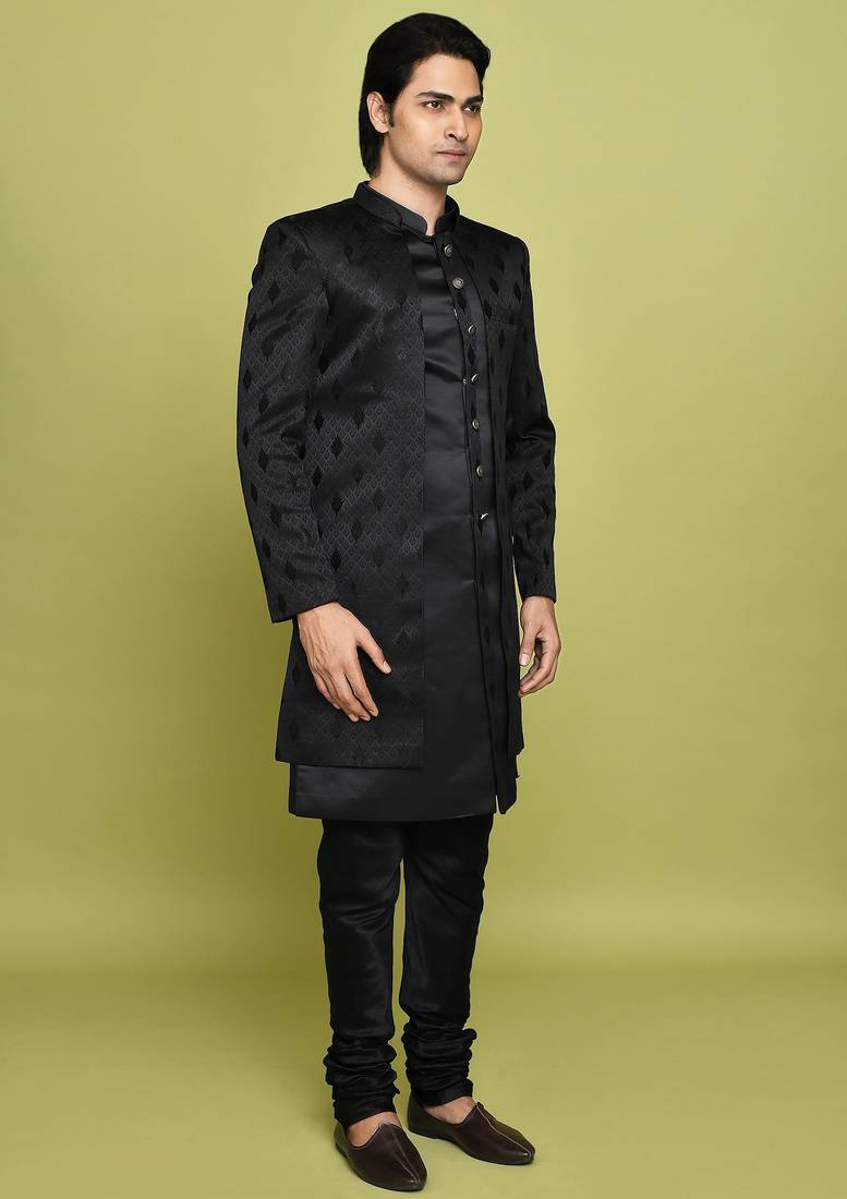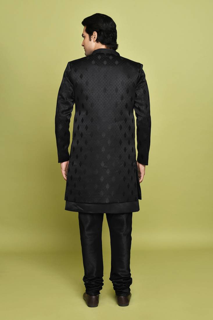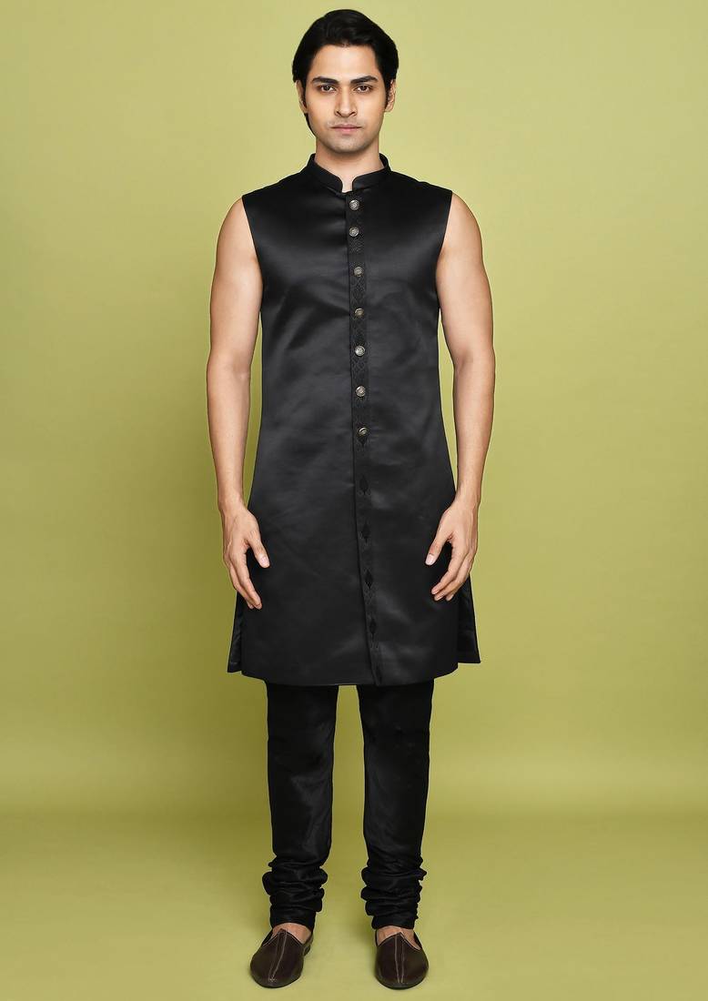 | Product Name | Black Front Open Pattern Design With Detached Inside Sleeveless Jacket Indo Western | |
