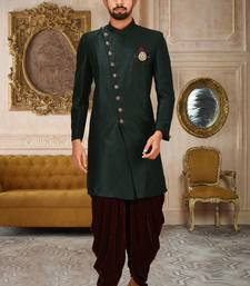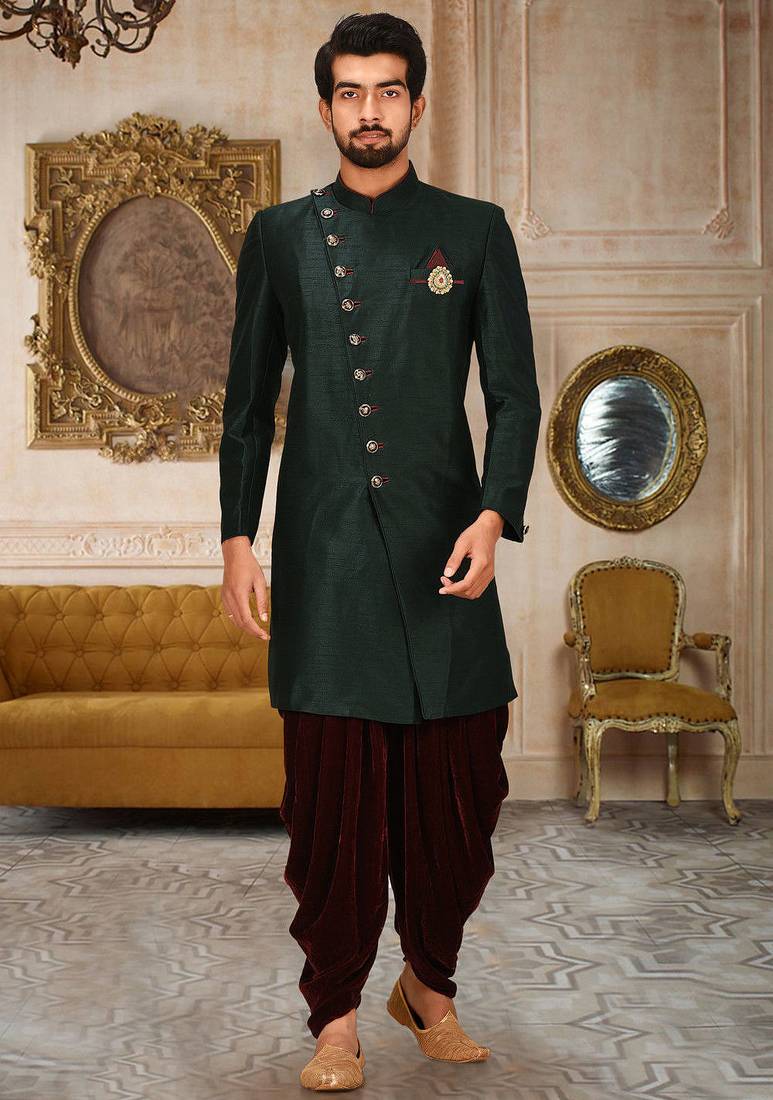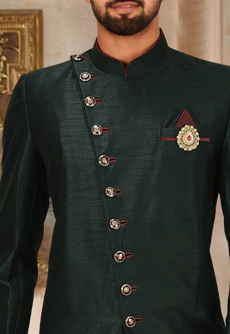 Bottle green anghrakha pattern work with mahroon pipe in indo western
