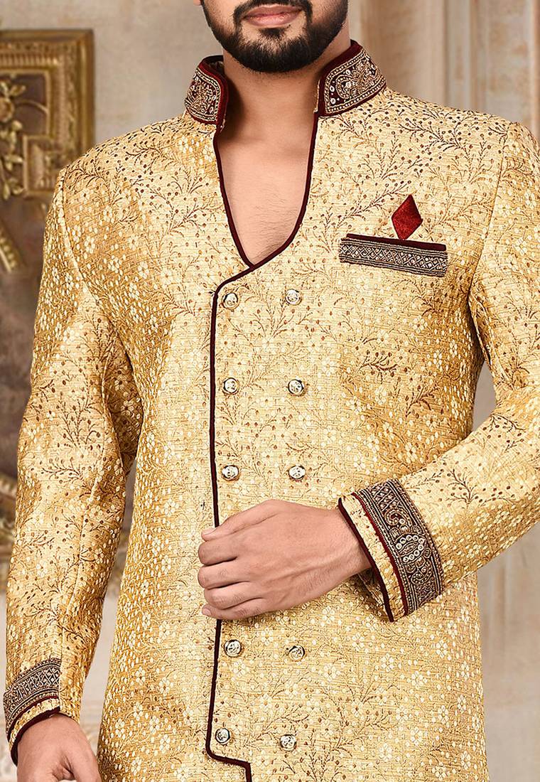 | Product Description | Anghrakha Pattern Work On Zari Jamewar Fabric With Handwork Along With Velvet Patch Work On Collar ,Hand And Chest Pocket |