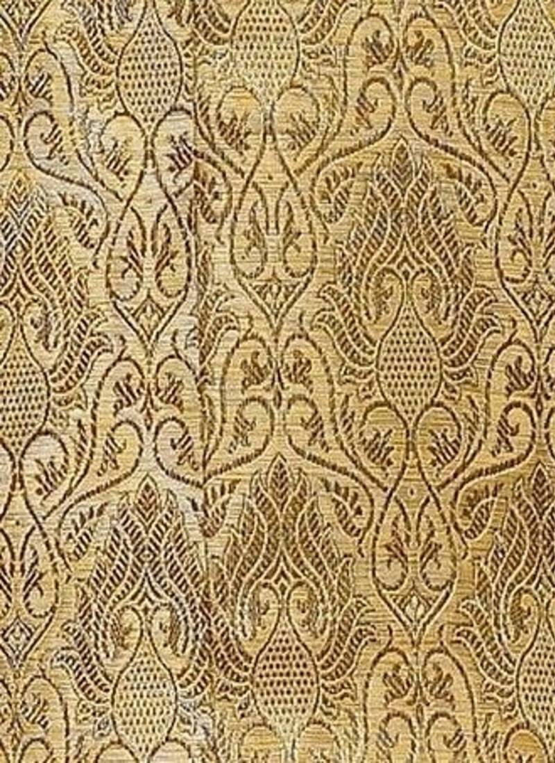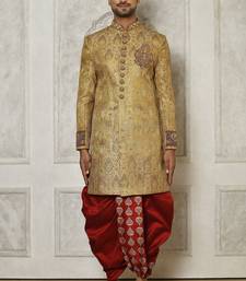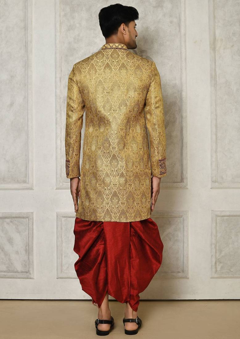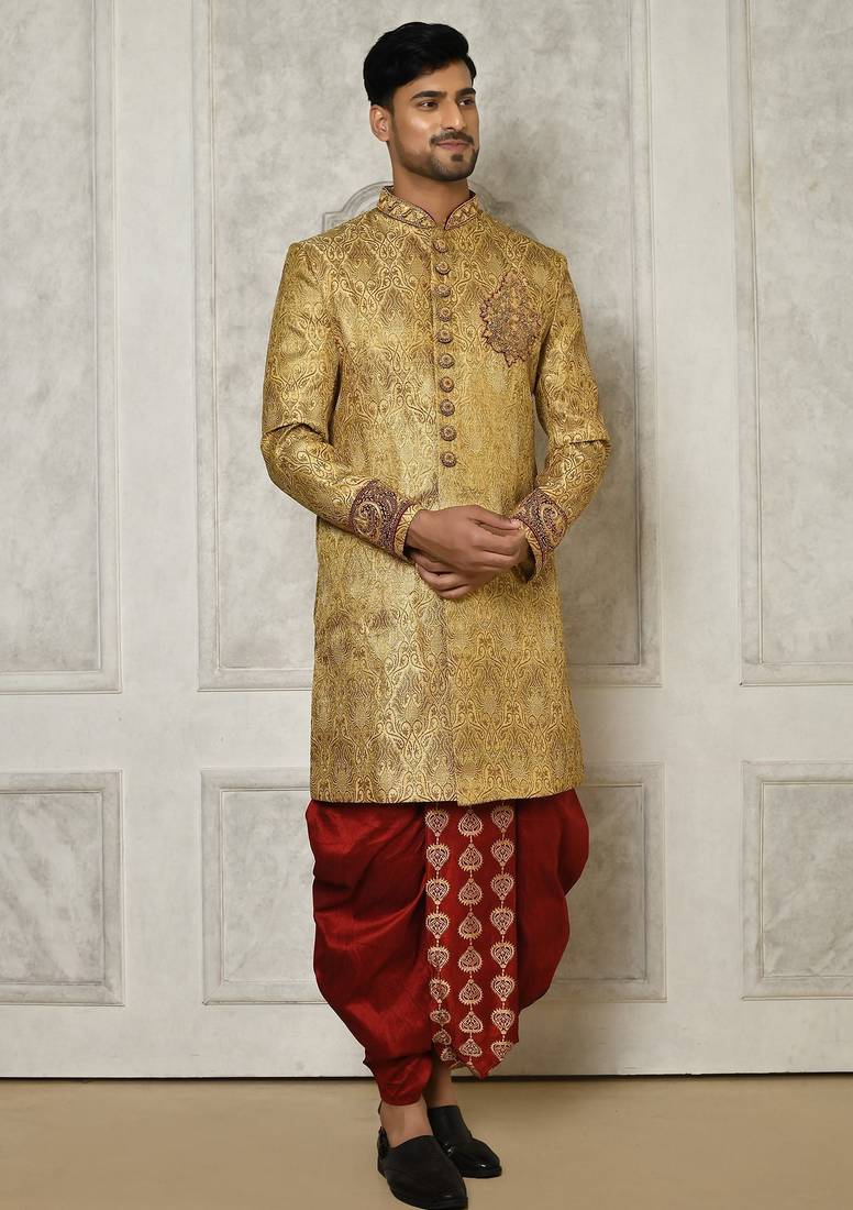 | Product Name | Gold Straight Pattern Work On Zari Jamewar Fabric With Hand Work On Collar ,Hand And Front Indo Western | |
