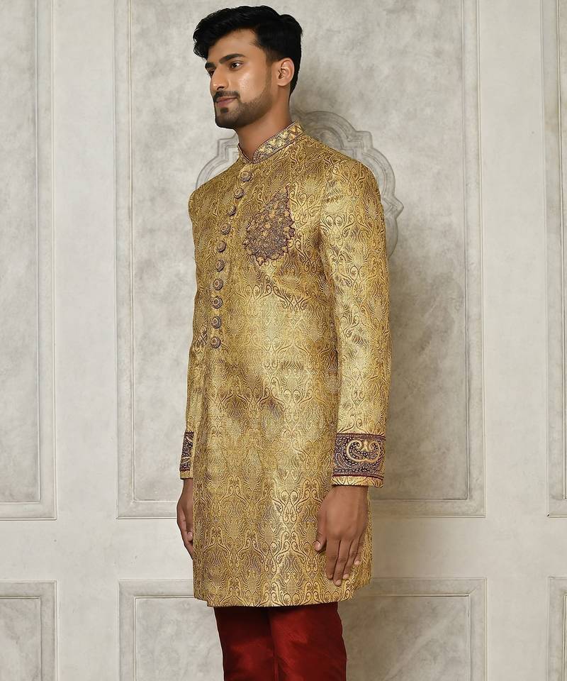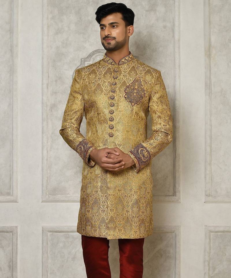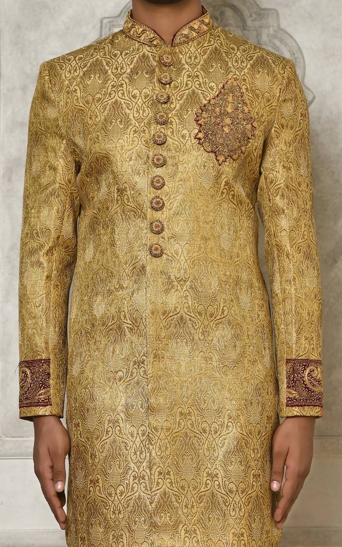 | Product Name | Gold Straight Pattern Work On Zari Jamewar Fabric With Hand Work On Collar ,Hand And Front Indo Western | |