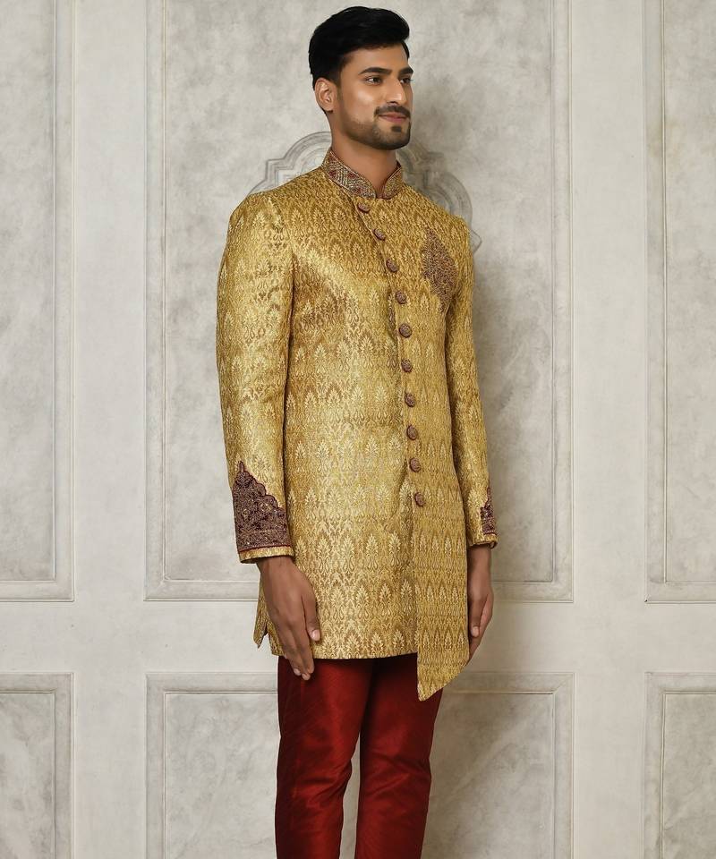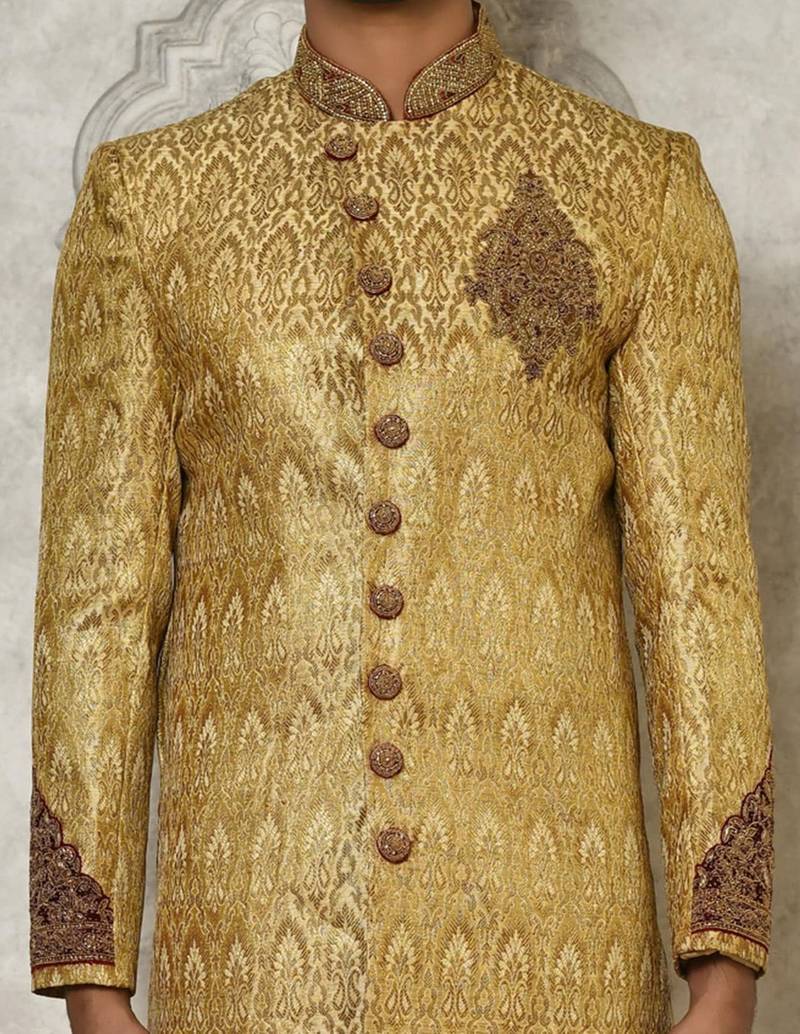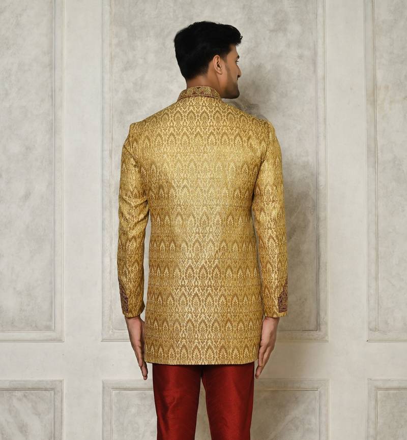 | Product Name | Gold Straight Pattern Work With Hand Work On Collar And Pocket Indo Western | |