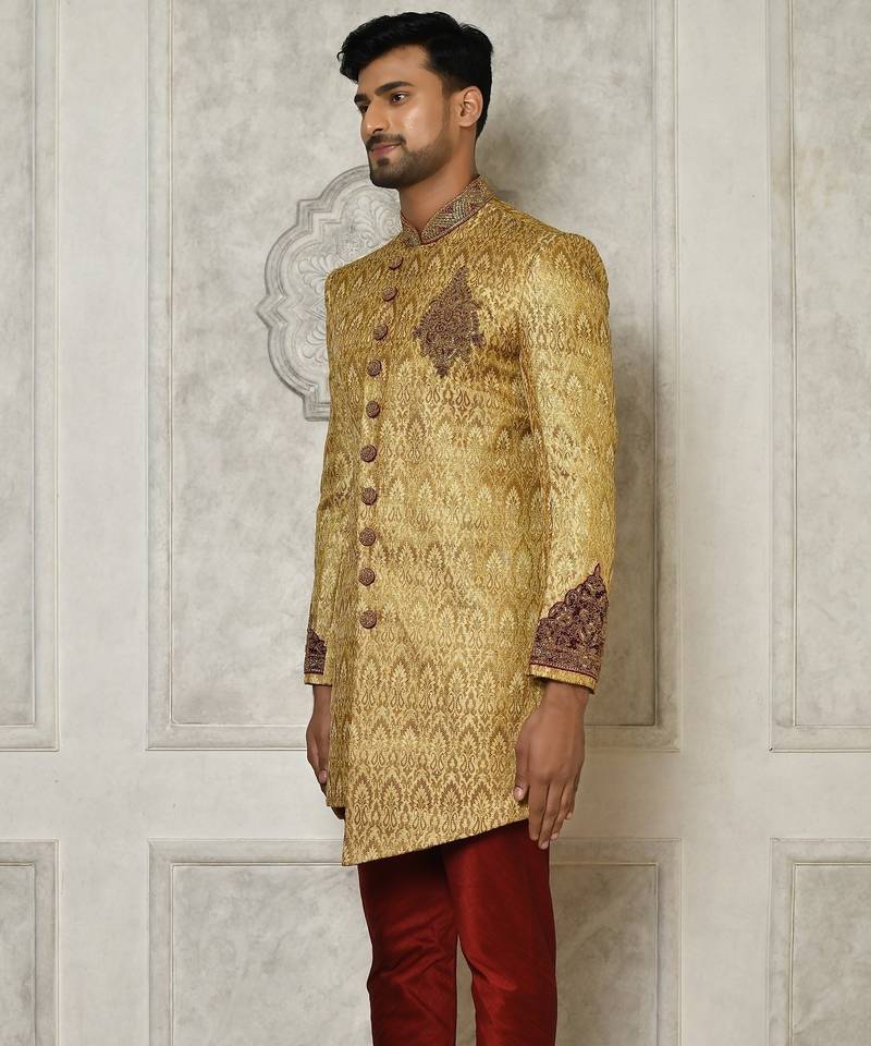 Gold straight pattern work with hand work on collar and pocket indo western