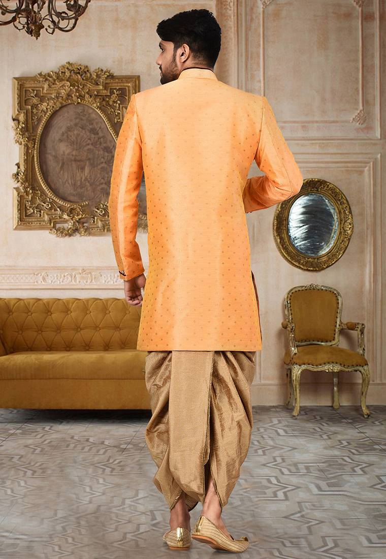 Orange anghrakha pattern work with mahroon pipe in indo western