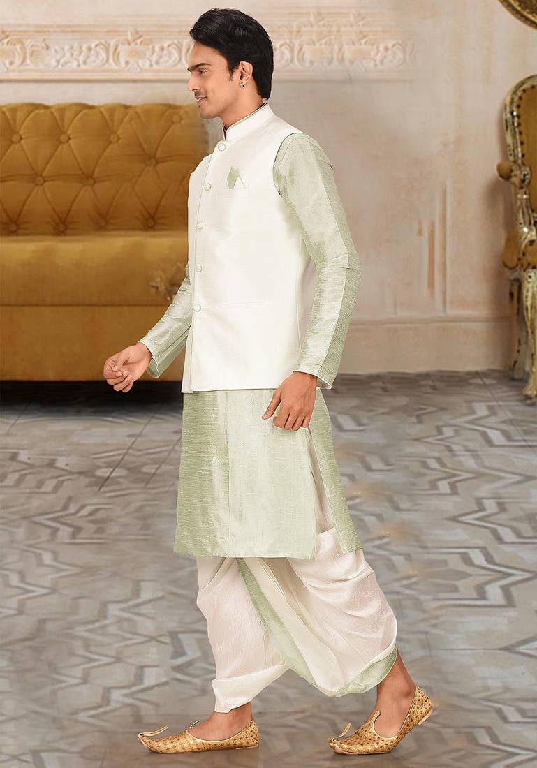 Sea green dupon art silk kurta, jacket with matching dhoti