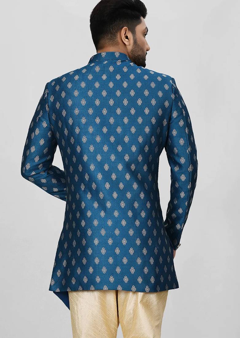 Teal green anghrakha pattern work with fawn pipe in indo western