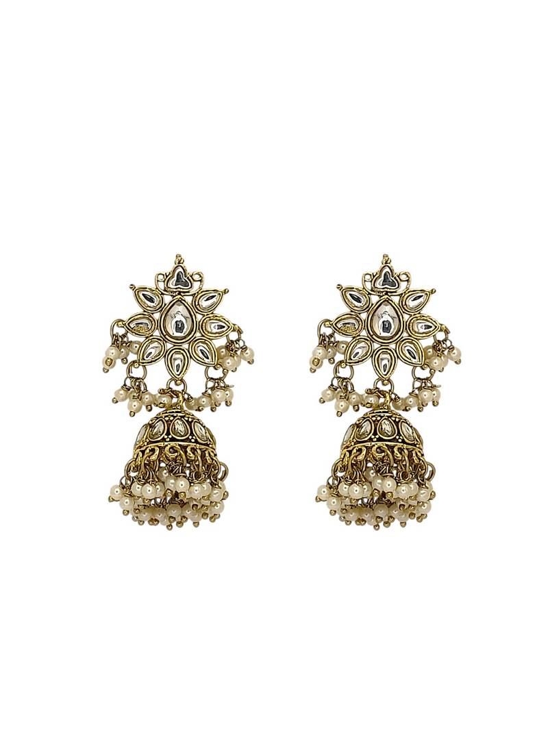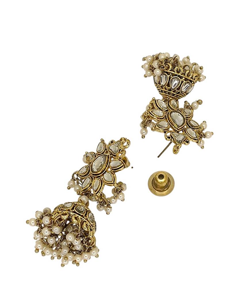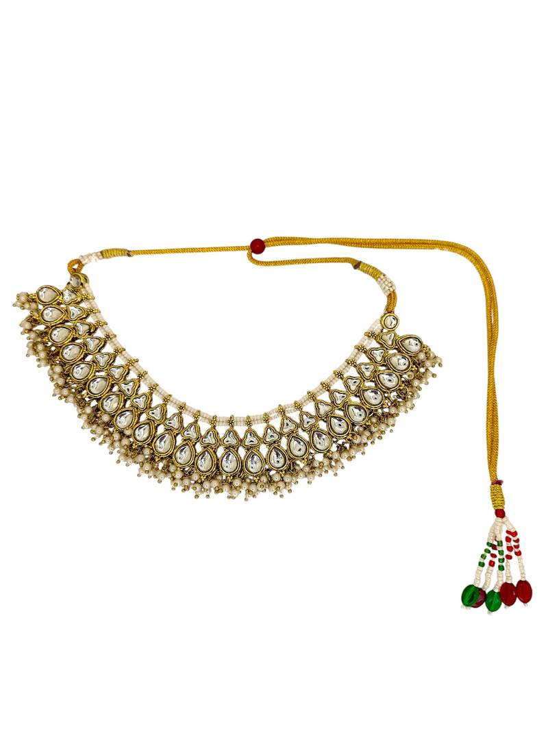 | Product Description | Antique Gold Toned Kundan And Beads Studded Necklace Set. Secured With Drawstring Closure. A Pair Of Matching Jhumka Earrings, Secured With Post And Back Closure. A Matching Maang Tikka. Secured With S Hook Closure.