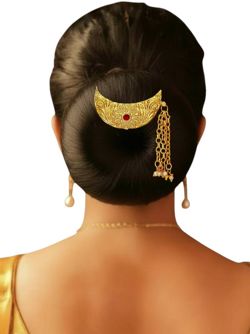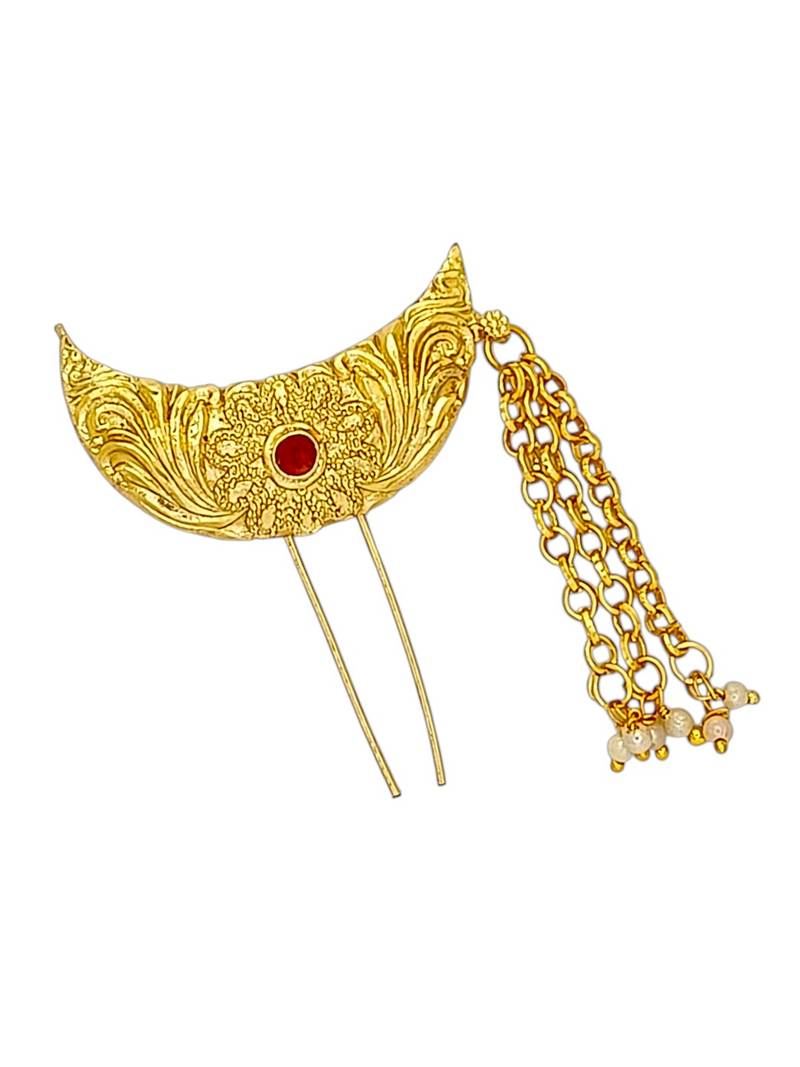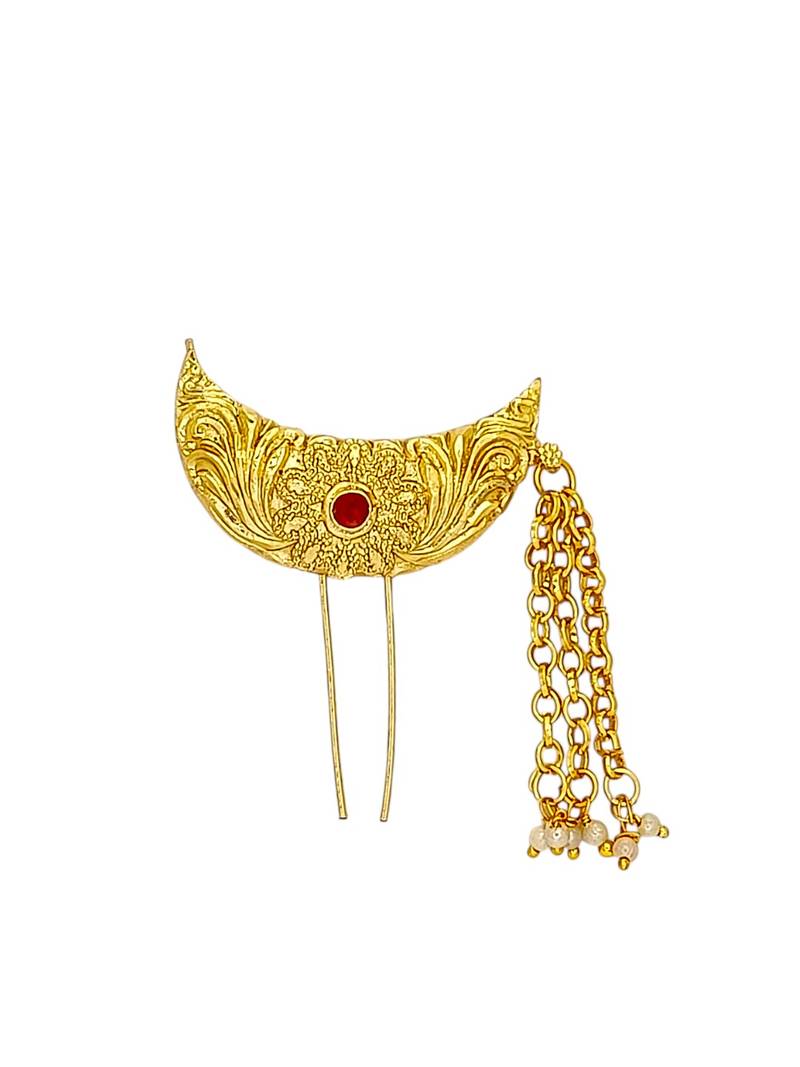 | Product Description | Gold Toned Chandrakor Bun Pin Crafted With A Graceful Crescent Inspired Design, Studded With Striking Red Stones And Enhanced With Hanging Chains And Pearls For A Traditional, Elegant Look. Ideal For Festive And Ceremonial Hairstyles, It Is Secured With A Sturdy Insert Closure To Ensure A Comfortable And Reliable Hold. Bun Pin Length: 4.3cm, Width: 1.5cm |