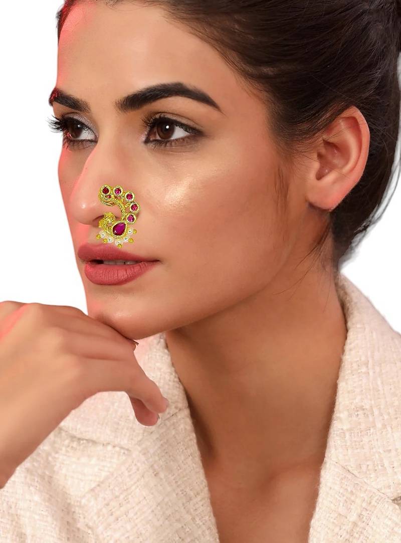 | Product Description | Gold Toned Dainty Peaccok Design Clip On Nose Pin Nose Ring, Studded With Red Stone And Beads. Secured With Clip On Closure