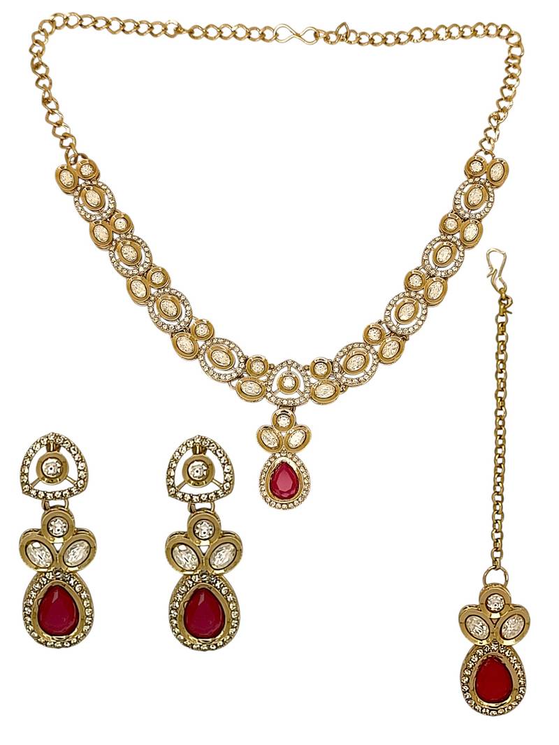 Gold Plated Kundan Polki Red Necklace Maang Tikka Set