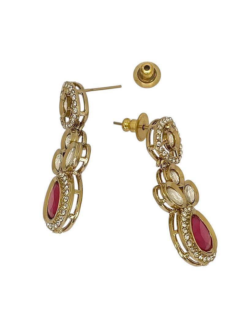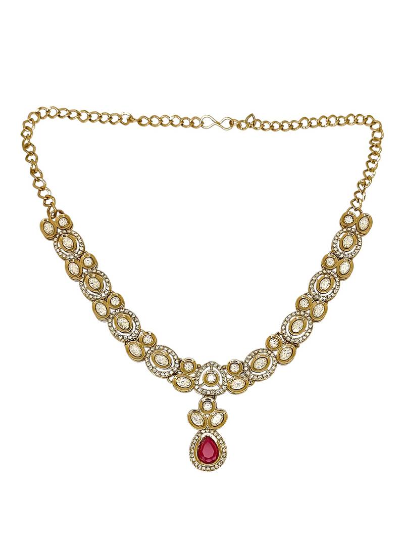 Gold Toned Oval Shape Red Necklace Set, Studded With Grace Polki, Cubic Zircon And Kundan. Secured With S Hook Closure. A Pair Of Matching Dangler Earrings, Secured With Post And Back Closure. A Matching Maang Tikka, Secured With S Hook Closure.