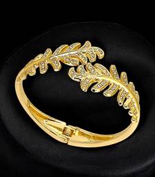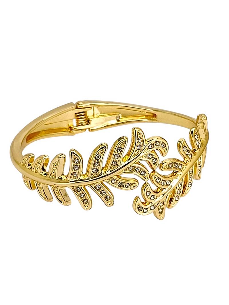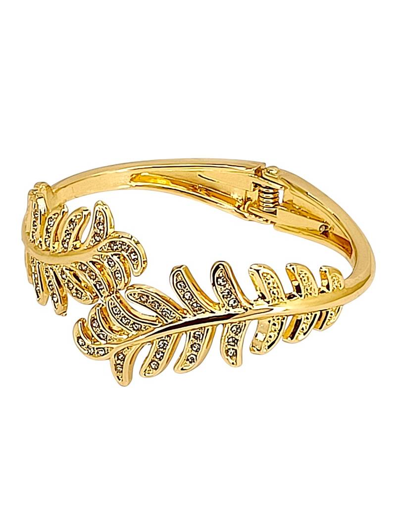 This Gold Plated Leaf Cz Hinge Cuff Bracelet Features An Elegant Leaf Inspired Design Embellished With Shimmering Cubic Zirconia Stones, Offering A Refined And Feminine Touch Suitable For Both Women And Girls; Crafted With A Polished Finish For Added Shine, It Includes A Convenient Hinged Structure That Allows For Easy Wearing And Ensures A Secure, Comfortable Fit, Making It A Versatile Accessory Perfect For Everyday Elegance Or Special Occasions. Diameter: 5.9cm, Width: 2cm