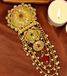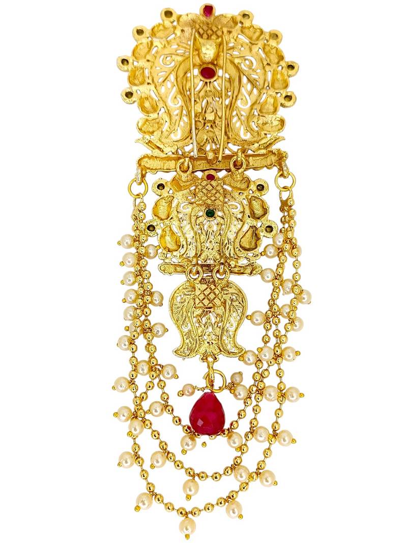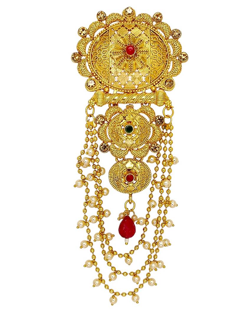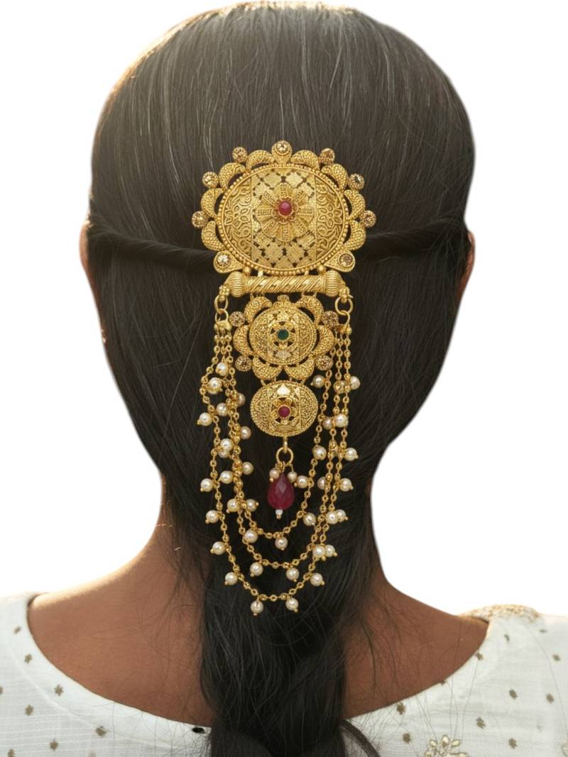 | Product Description | Gold Toned Traditional Layered Bun Pin Designed To Add Timeless Elegance To Festive And Bridal Hairstyles, Beautifully Studded With Red And Green Stones And Accented With Delicate Pearls For A Rich, Ornate Look. The Layered Detailing Enhances Its Classic Appeal, While The Sturdy Insert Closure Ensures A Secure, Comfortable Hold Throughout The Day. Bun Pin Length: 15cm, Width: 5.7cm |