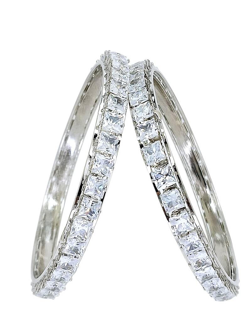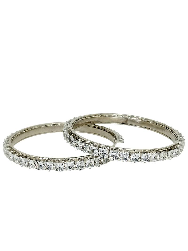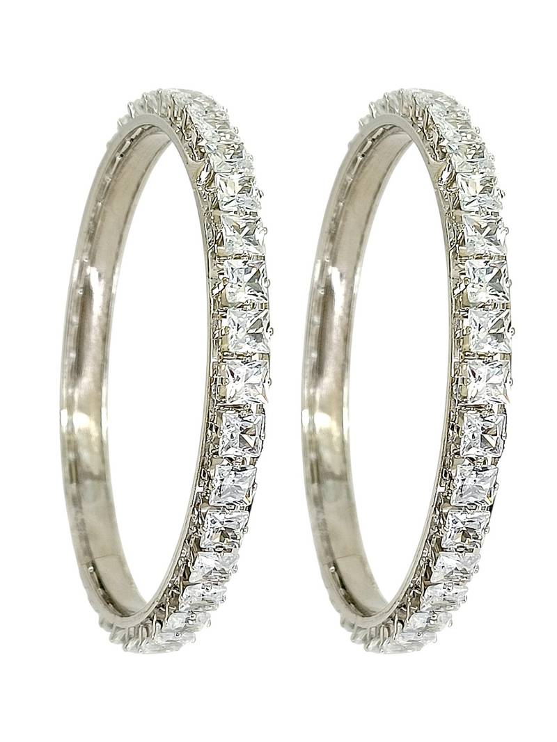 | Product Description | Set Of 2 Rhodium Plated Square Shape Princess Cut American Diamond Bangles. Secured With Slip On Closure