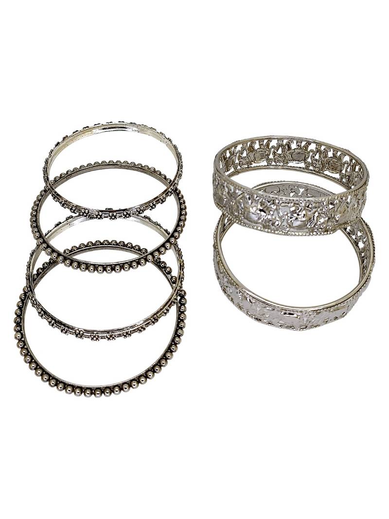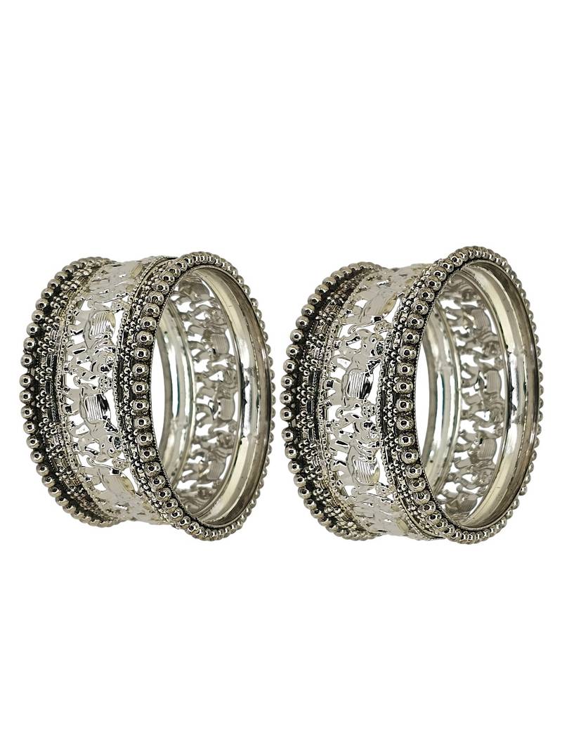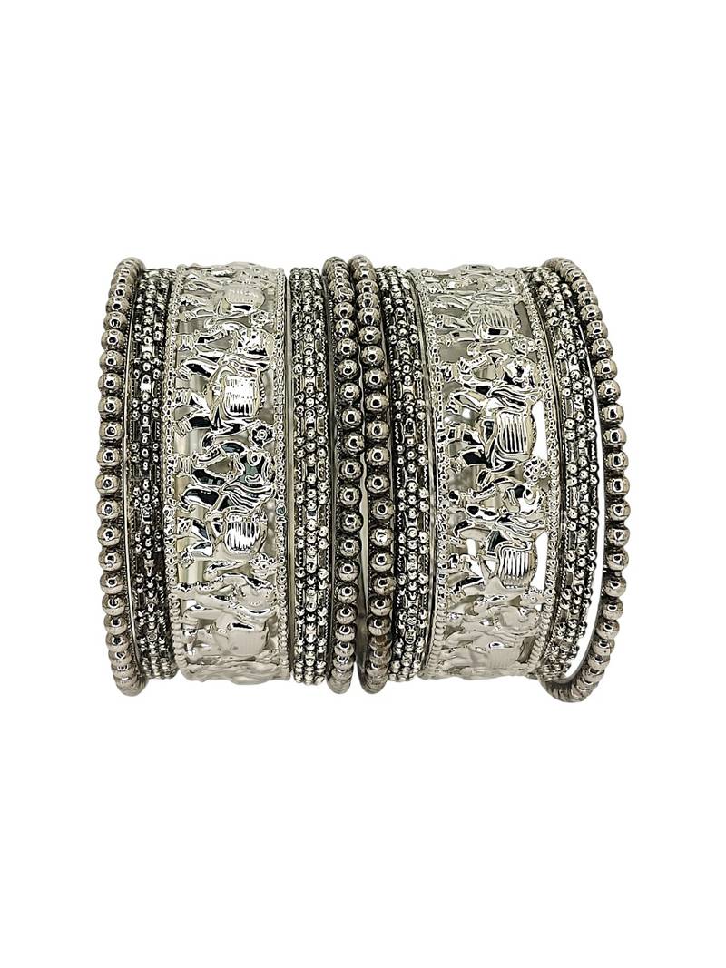 | Product Description | Set Of 10 Chuda Set With Set Of 2 Silver Oxidised Elephant Motif Bangles, Each Secured With Slip On Closure. Set Of 4 Silver Oxidised Segmented Pattern Bangles, Each Secured With Slip On Closure. Set Of 4 Silver Oxidised Beaded Bangles, Each Secured With Slip On Closure.