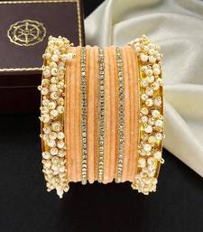 | Product Description | Set Of 17 Chuda Set With Set Of 2 Gold Toned Beaded Kada Bangle Set, Each Secured With Slip On Closure. Set Of 3 Gold Toned Cubic Zircon Studded Thin Bangles, Each Secured With Slip On Closure. Set Of 12 Peach Velvet Bangle Set, Each Secured With Slip On Closure.