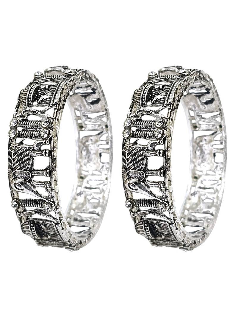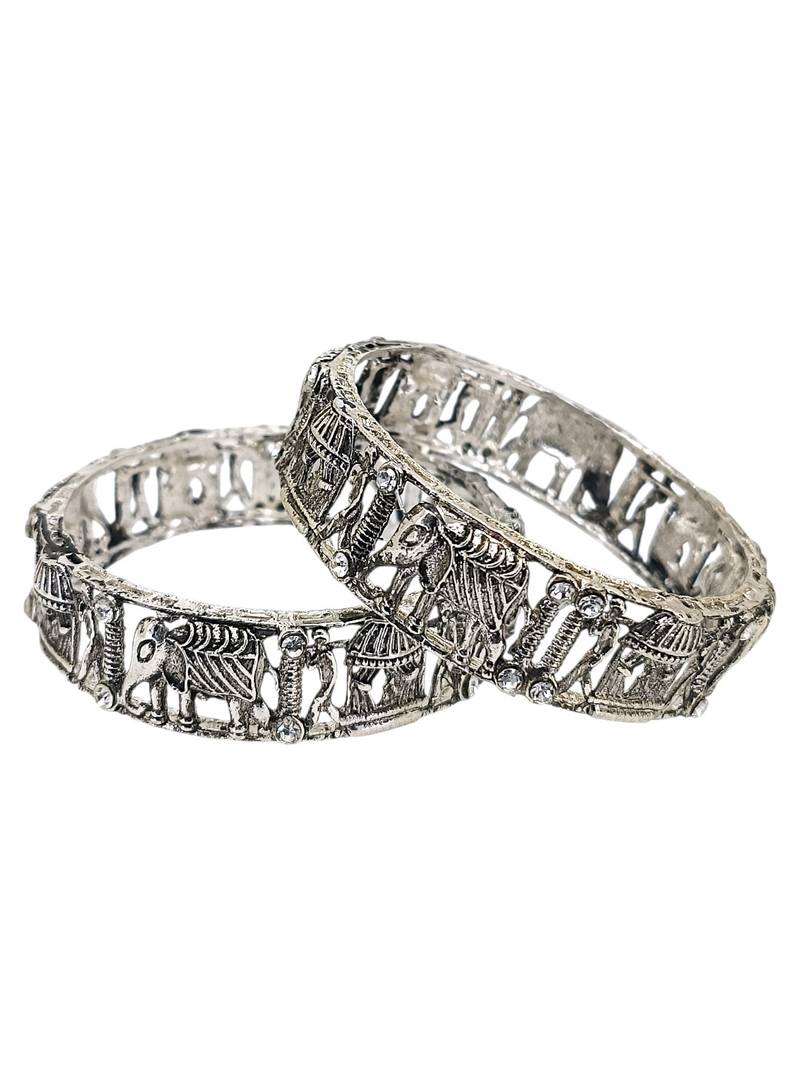 | Product Description | Set Of 2 Silver Oxidised Elephant And Bride Doli Motif Bangles, Studded With Cubic Zircon. Secured With Slip On Closure