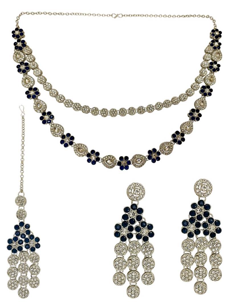 Silver Plated Floral Design Layered Blue Necklace Maang Tikka Set