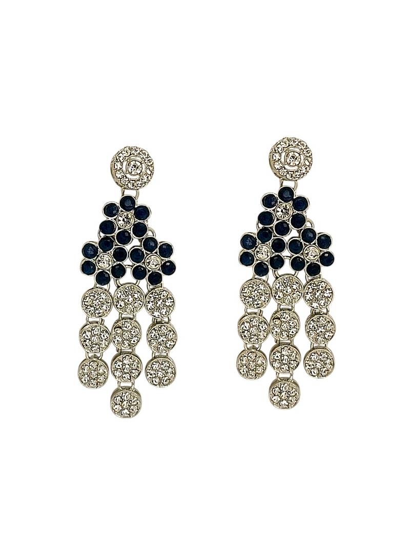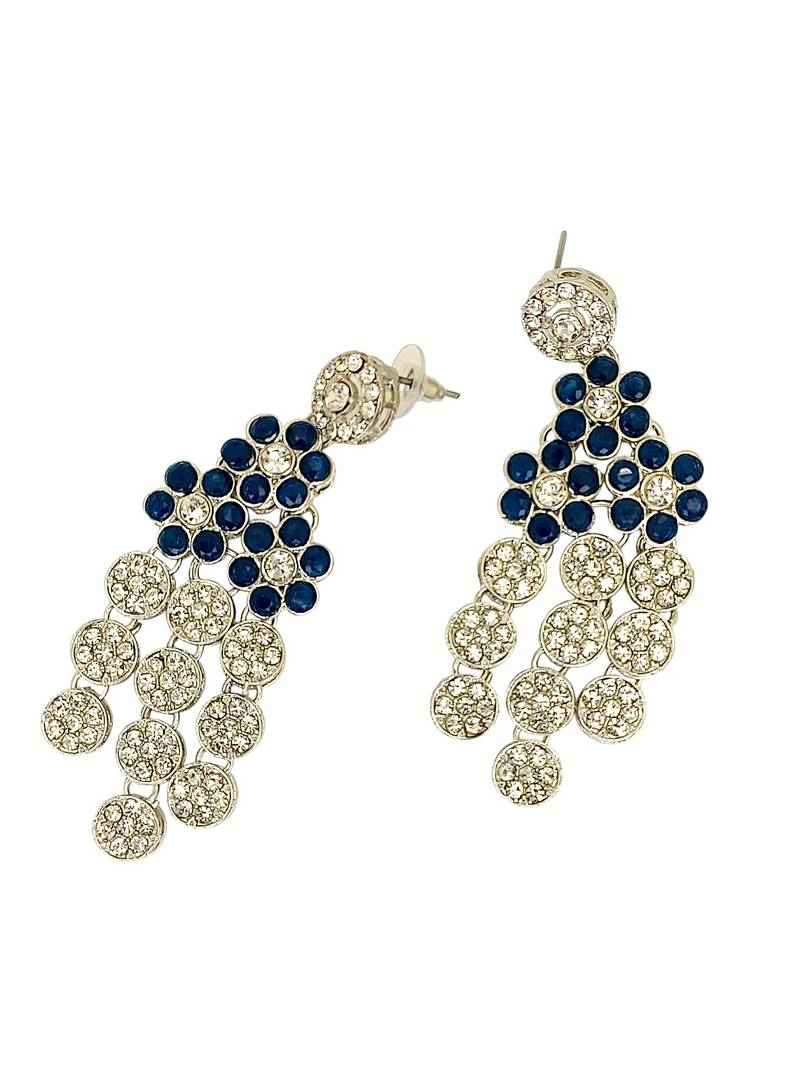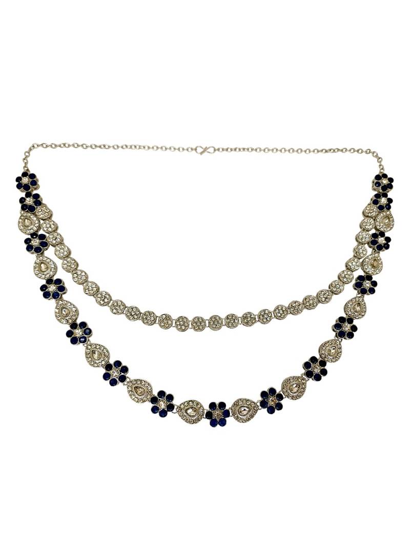 Silver Toned Floral Design Layer Necklace Set, Studded With Dark Blue Color Stone And Cubic Zircon. Secured With S Hook Closure. A Pair Of Matching Dangler Earrings, Secured With Post And Back Closure. A Matching Maang Tikka, Secured With S Hook Closure.