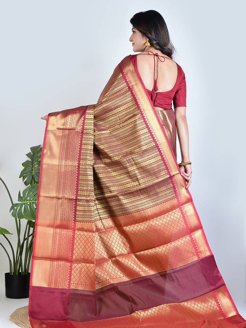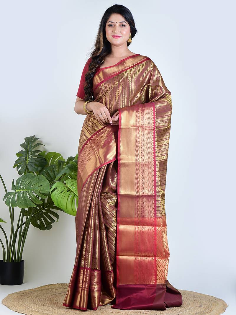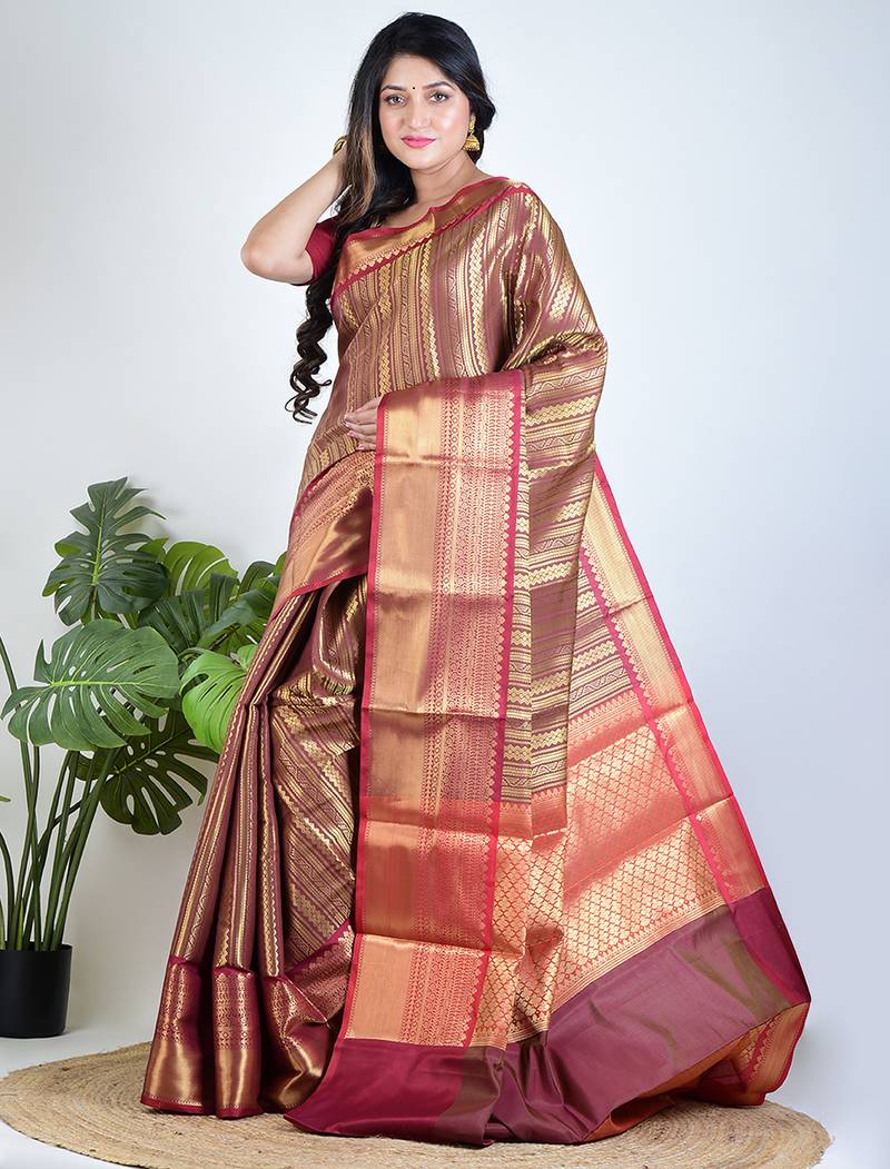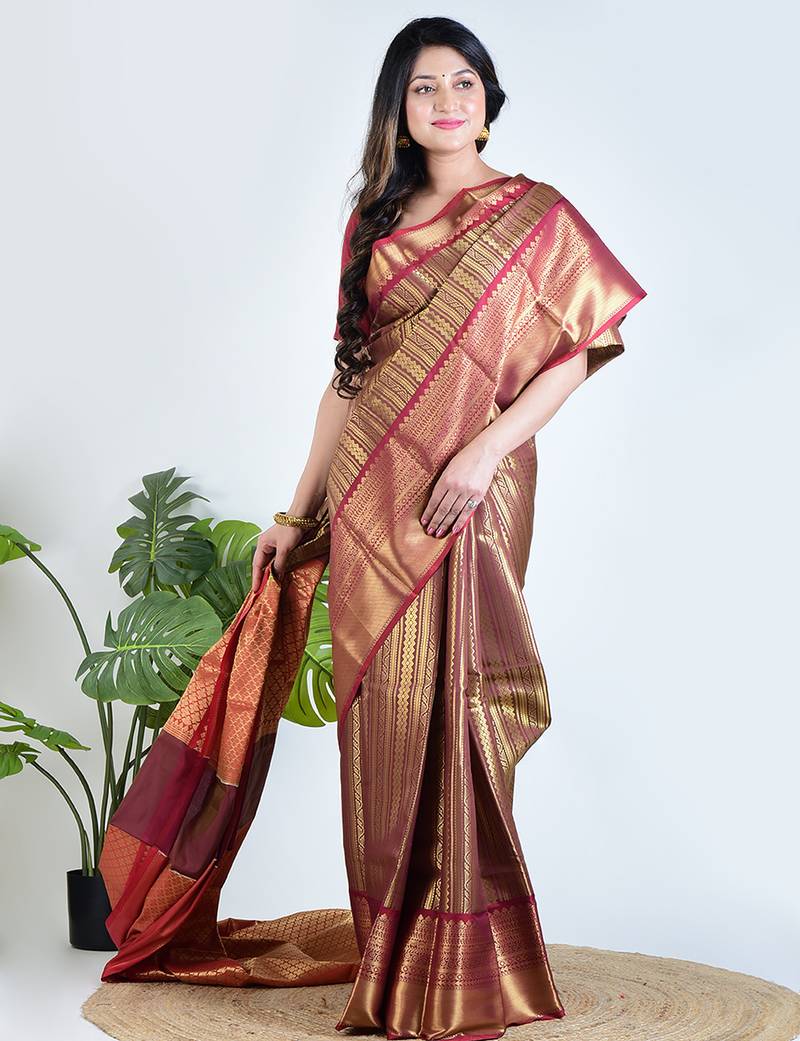 Maroon Majesty Reflects The Richness Of Banarasi Heritage With A Graceful And Regal Touch. Crafted In Banarasi Tissue Fabric, This Saree Carries A Delicate Golden Shimmer That Enhances Its Luxurious Appearance. The Deep Maroon Tone Paired With Gold Creates A Timeless Combination Associated With Celebration And Elegance.