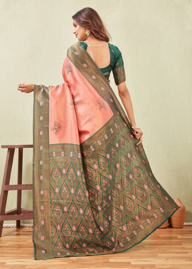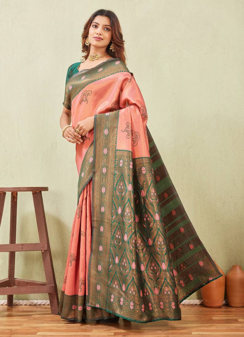 Green gajri art silk jacuard work designer party wear saree with unstitched blouse piece
