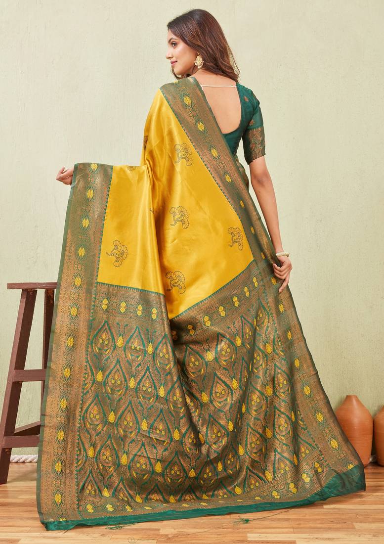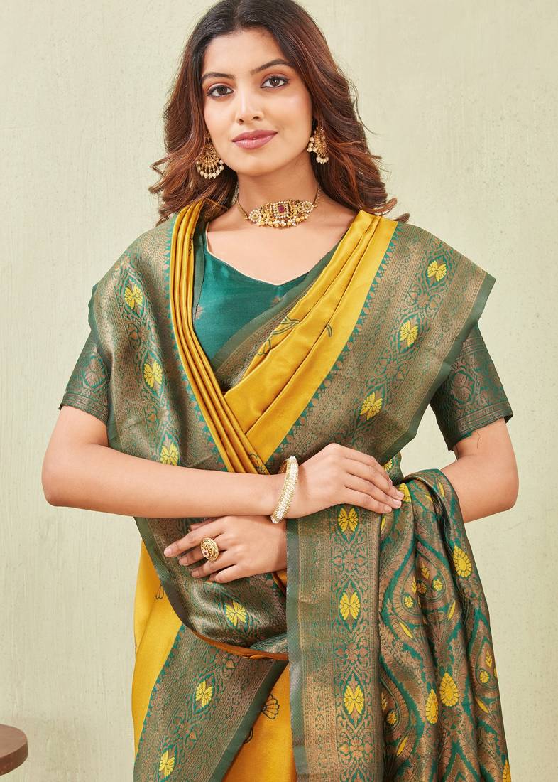 Green gold art silk jacuard work designer party wear saree with unstitched blouse piece