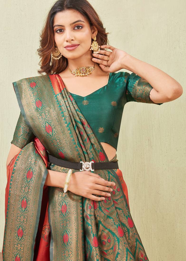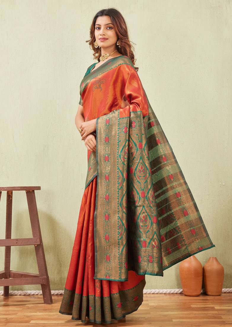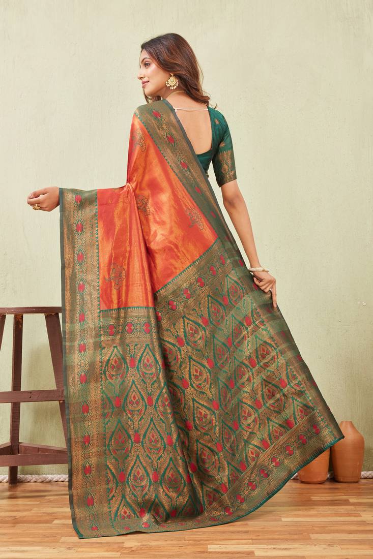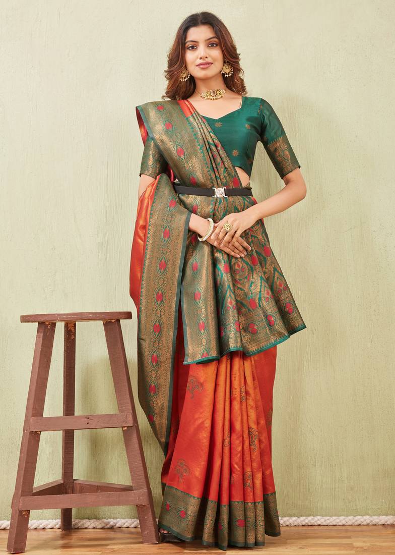 Green orange art silk jacuard work designer party wear saree with unstitched blouse piece