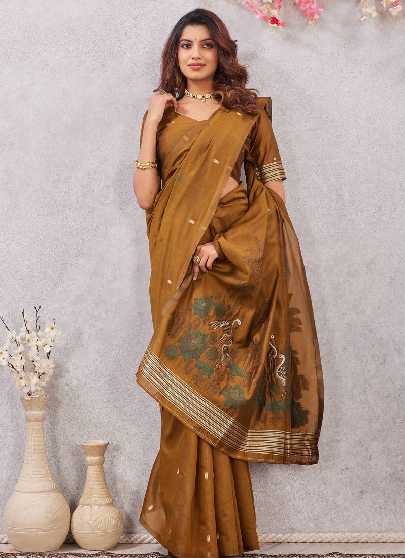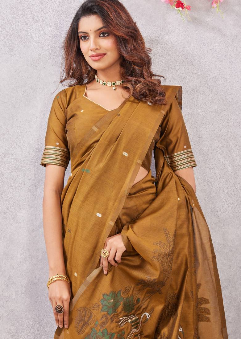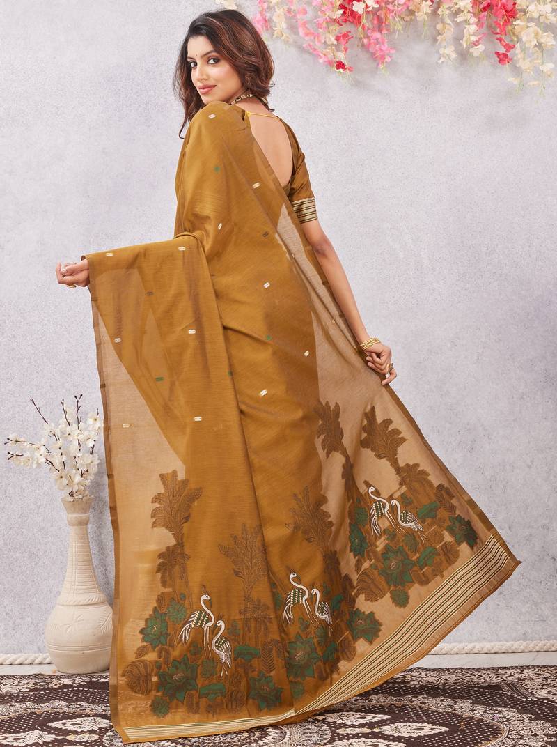 Mustard lillen jacuard work designer party wear saree with unstitched blouse piece
