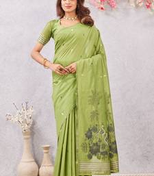 Parrot green lillen jacuard work designer party wear saree with unstitched blouse piece