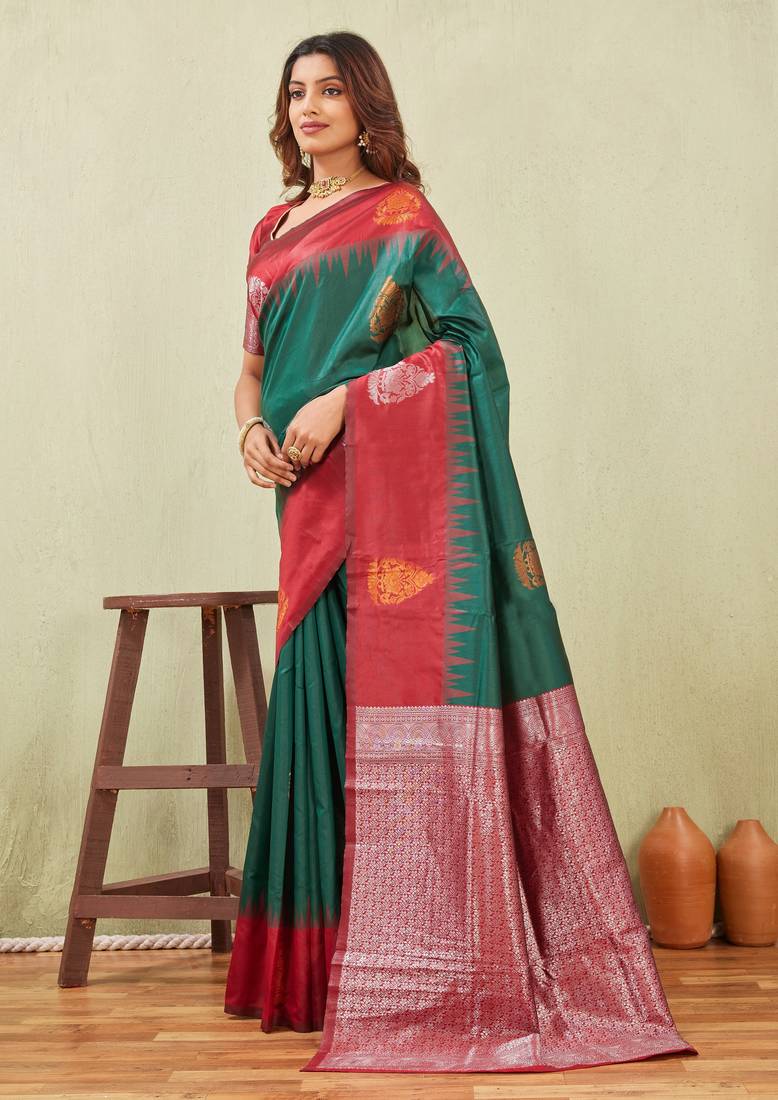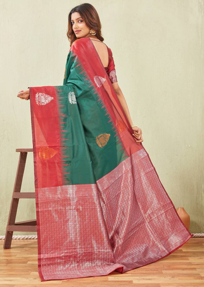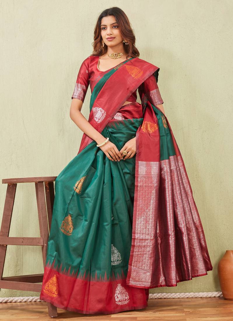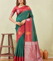 Red green art silk jacuard work designer party wear saree with unstitched blouse piece
