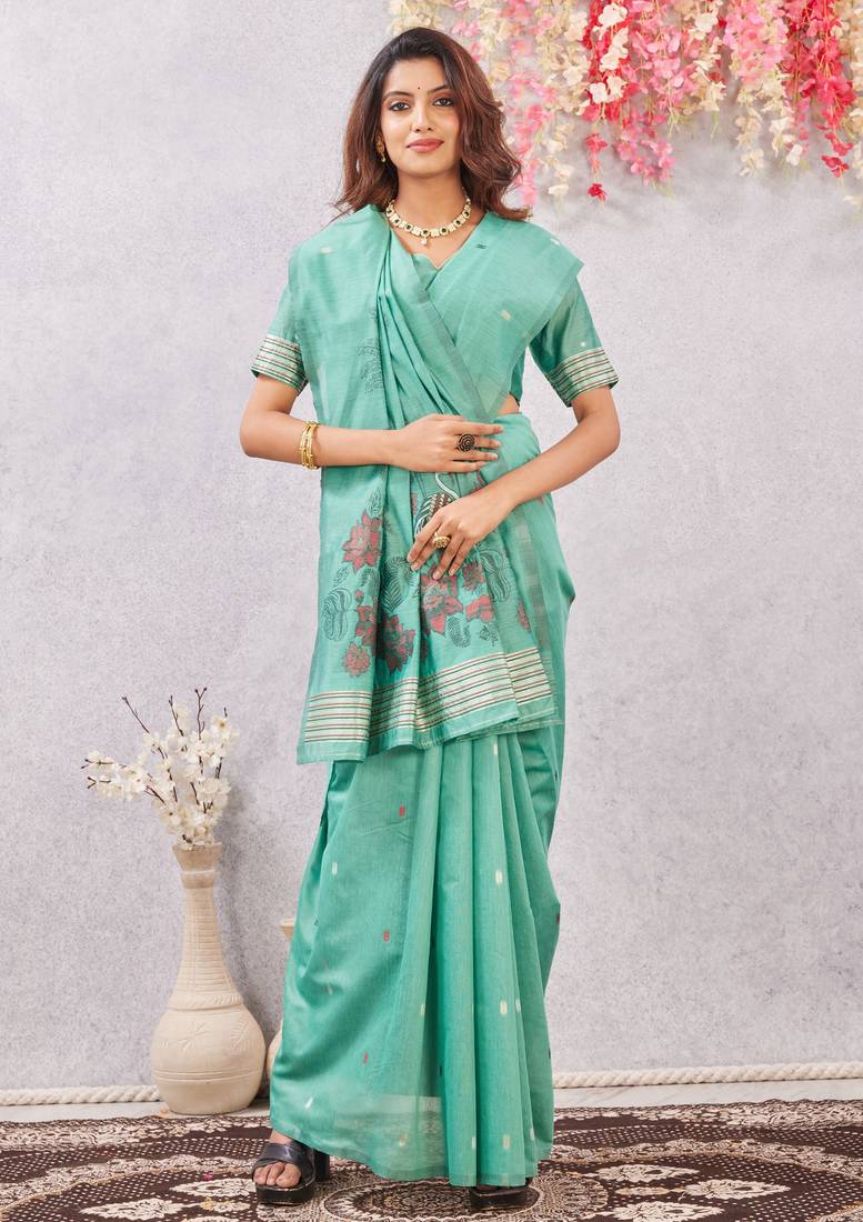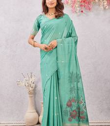 Sea green lillen jacuard work designer party wear saree with unstitched blouse piece