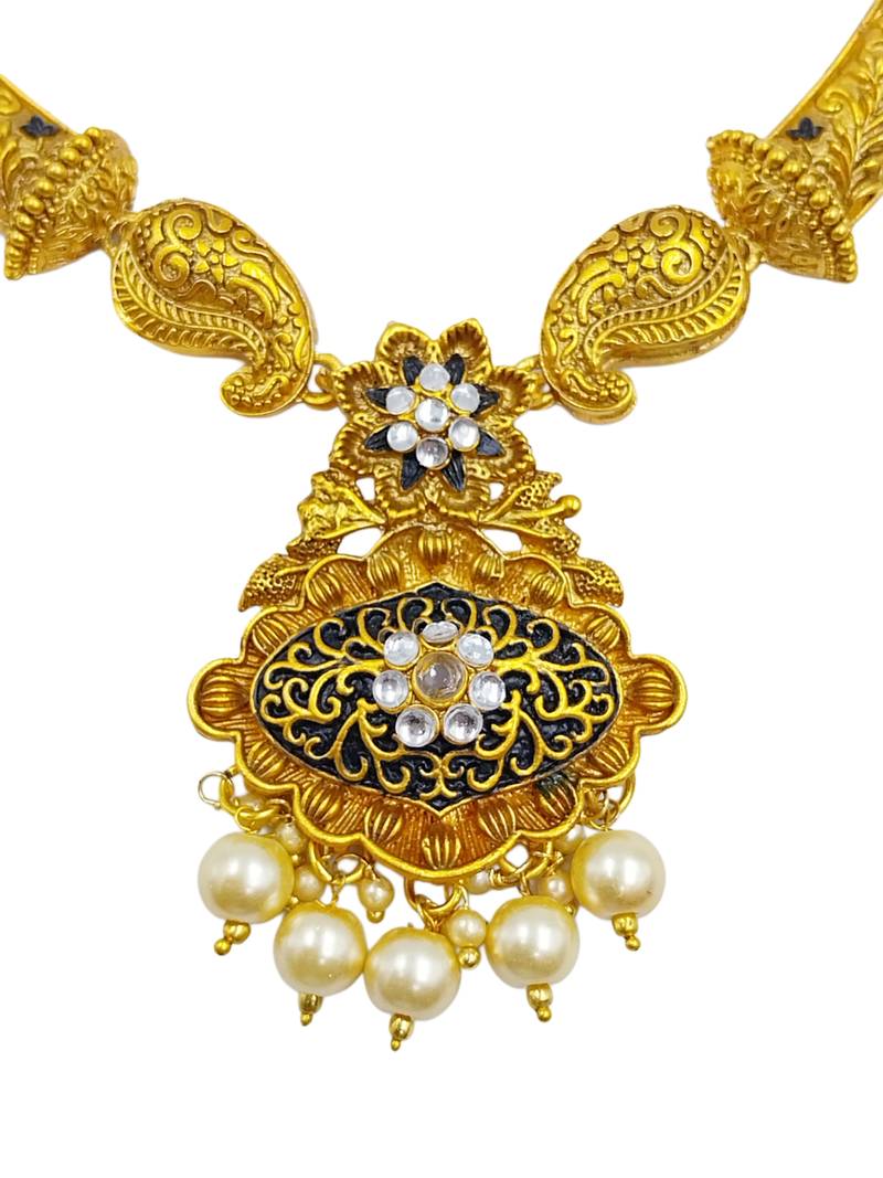 Product Description | Elegant Antique Gold Tone Necklace Set With Intricate Detailing, Kundan Stones, And Pearl Drops. Perfect For Weddings, Festivals, And Traditional Occasions. |