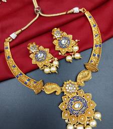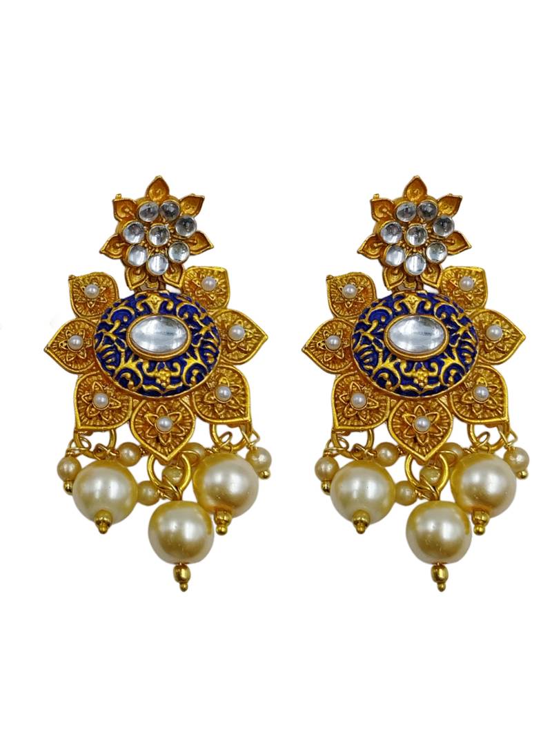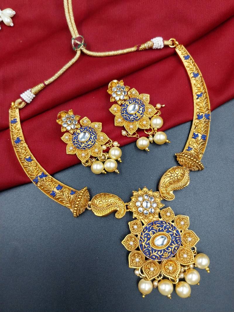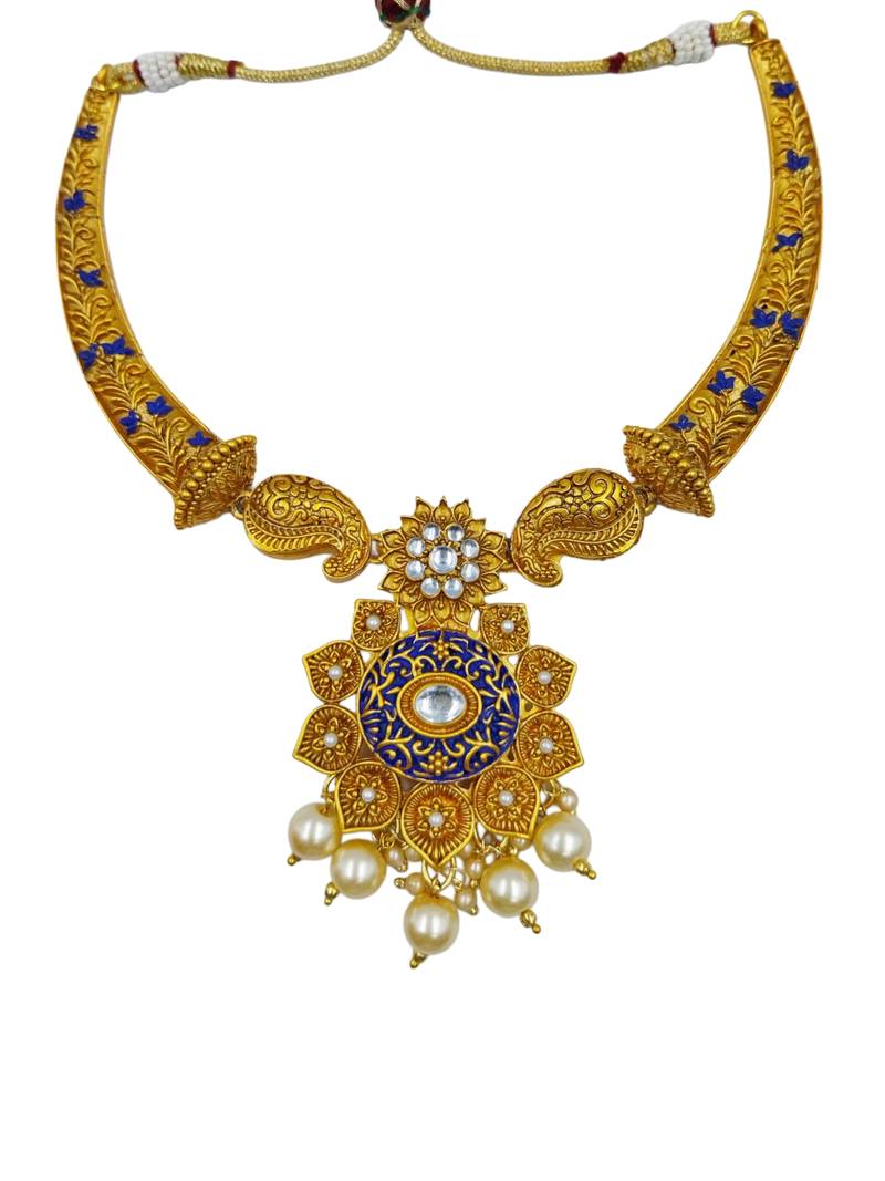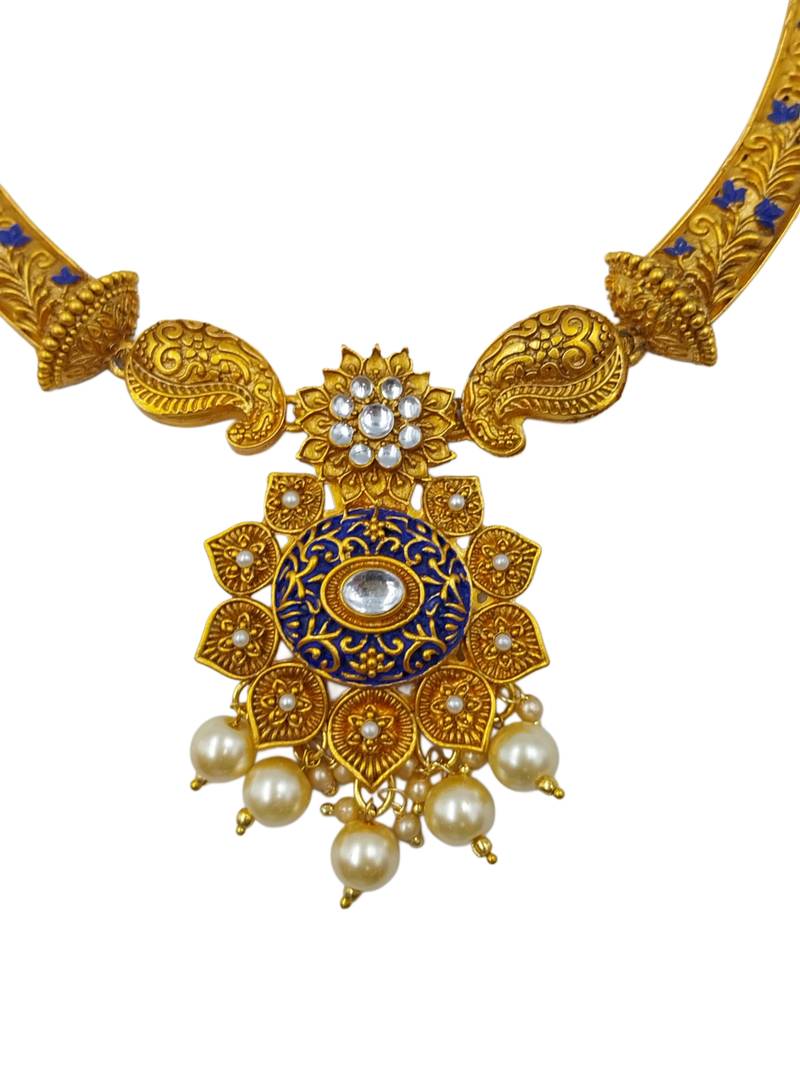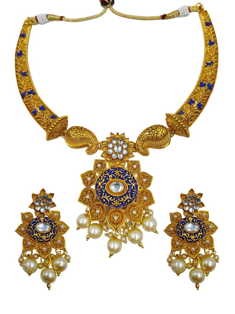 Product Name ​Antique Gold Plated Blue & Gold Meenakari Necklace Set With Pearl Drops.