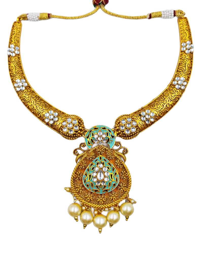 Product Description | Elegant Antique Gold Tone Necklace Set With Intricate Detailing, Kundan Stones, And Pearl Drops. Perfect For Weddings, Festivals, And Traditional Occasions. |