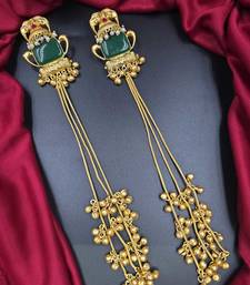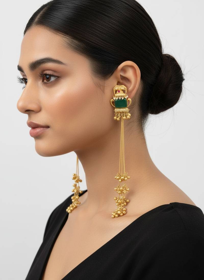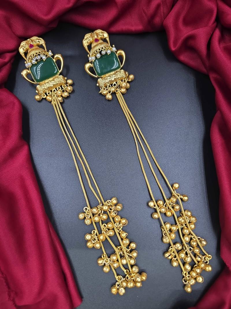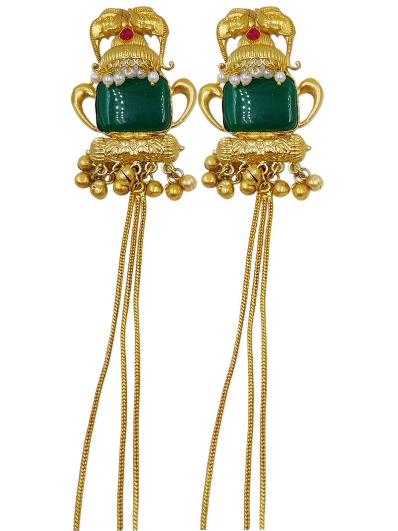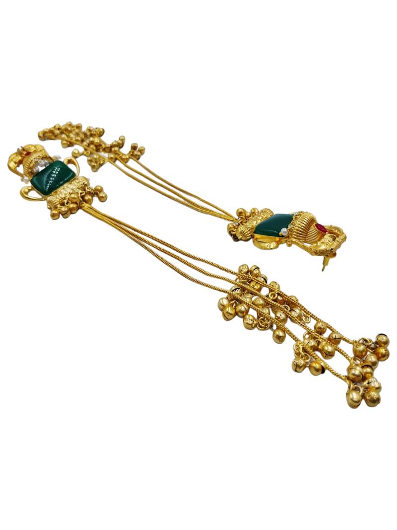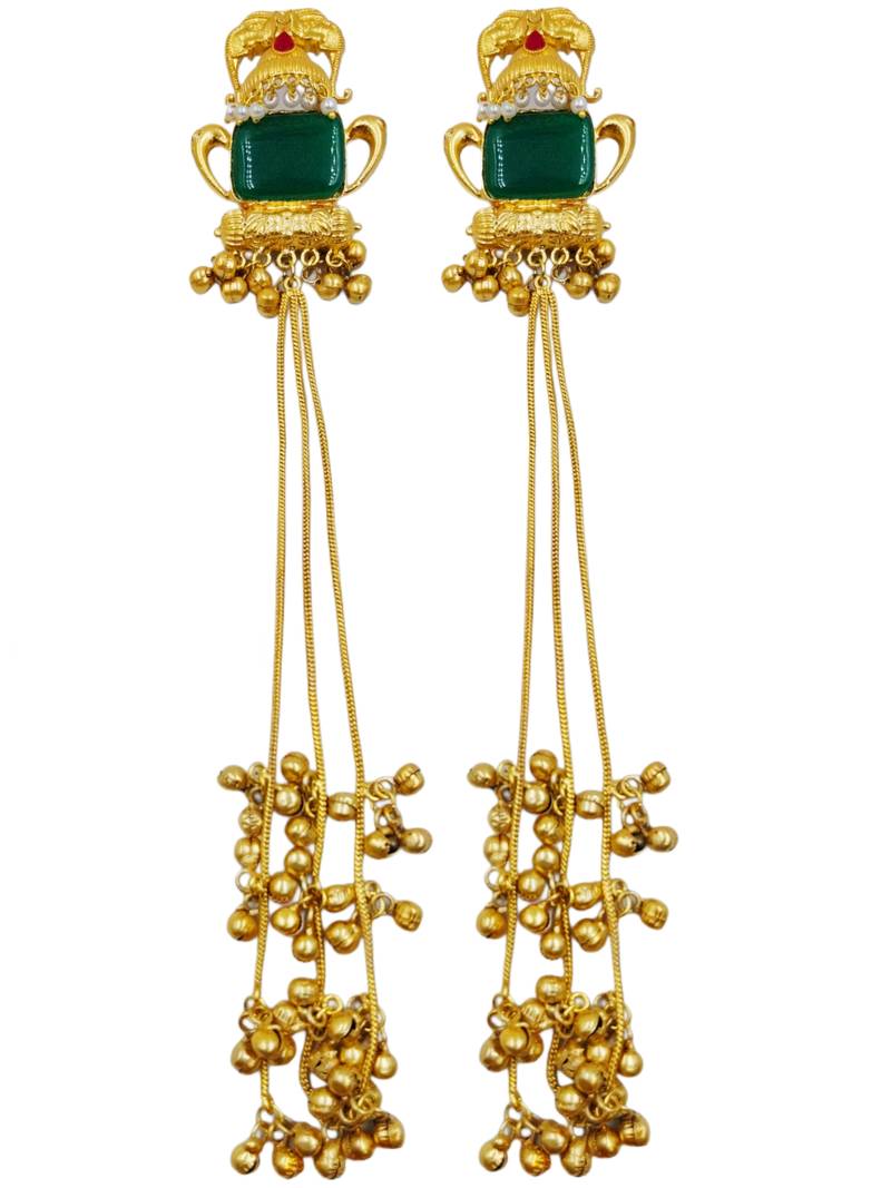 | Product Name | Traditional Gold Plated Kashmiri Jhumka Earrings With Long Chains & Green Stone | |