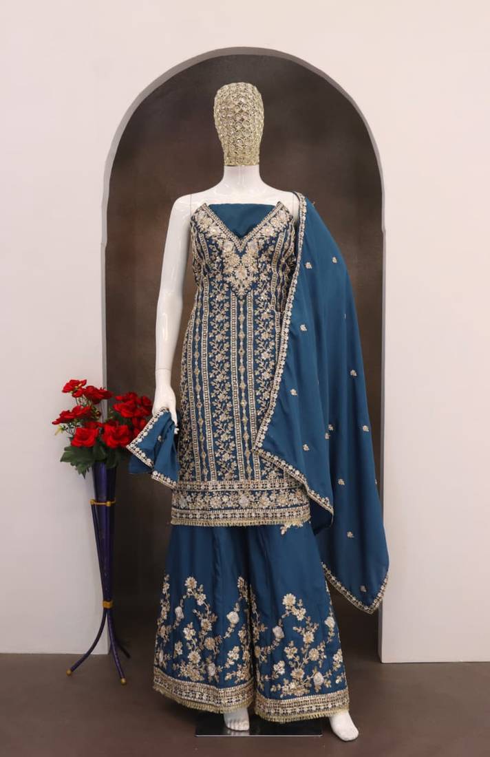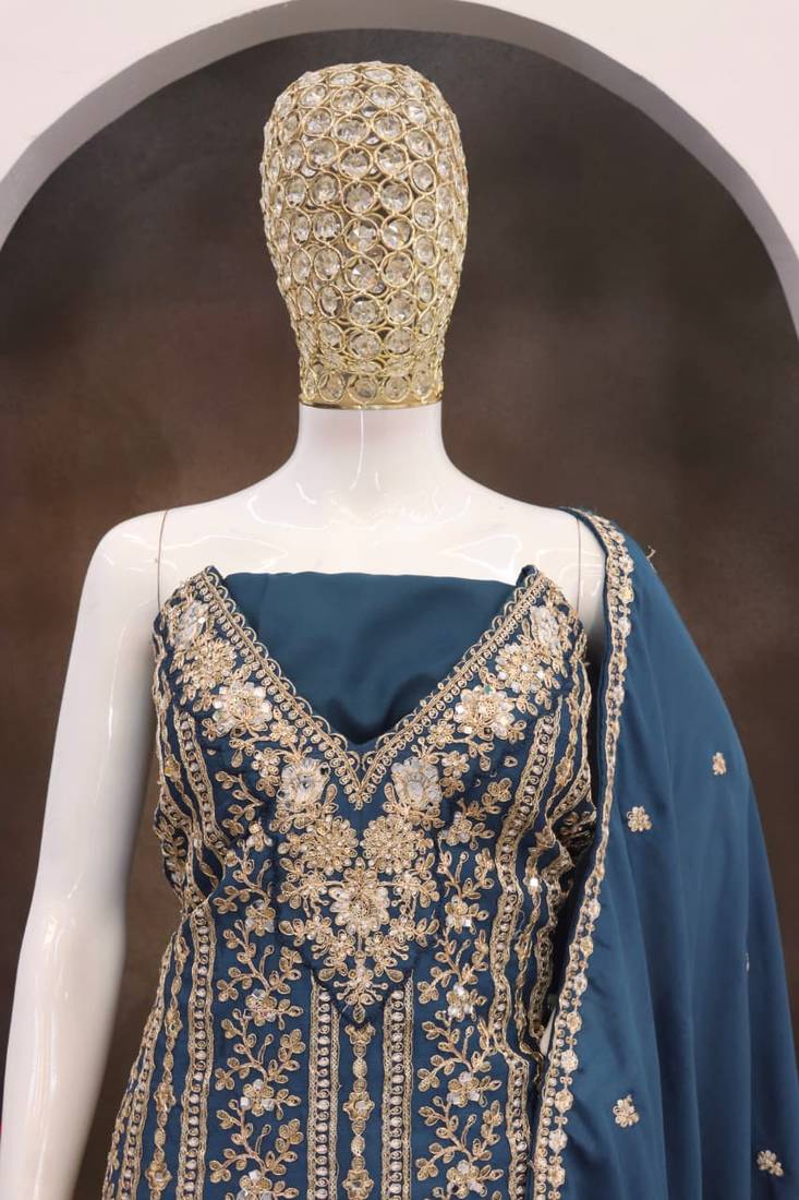 Navy blue embroidered chinon silk wedding suits semi stitched