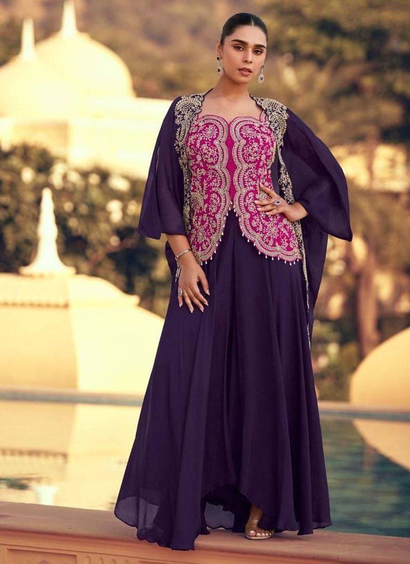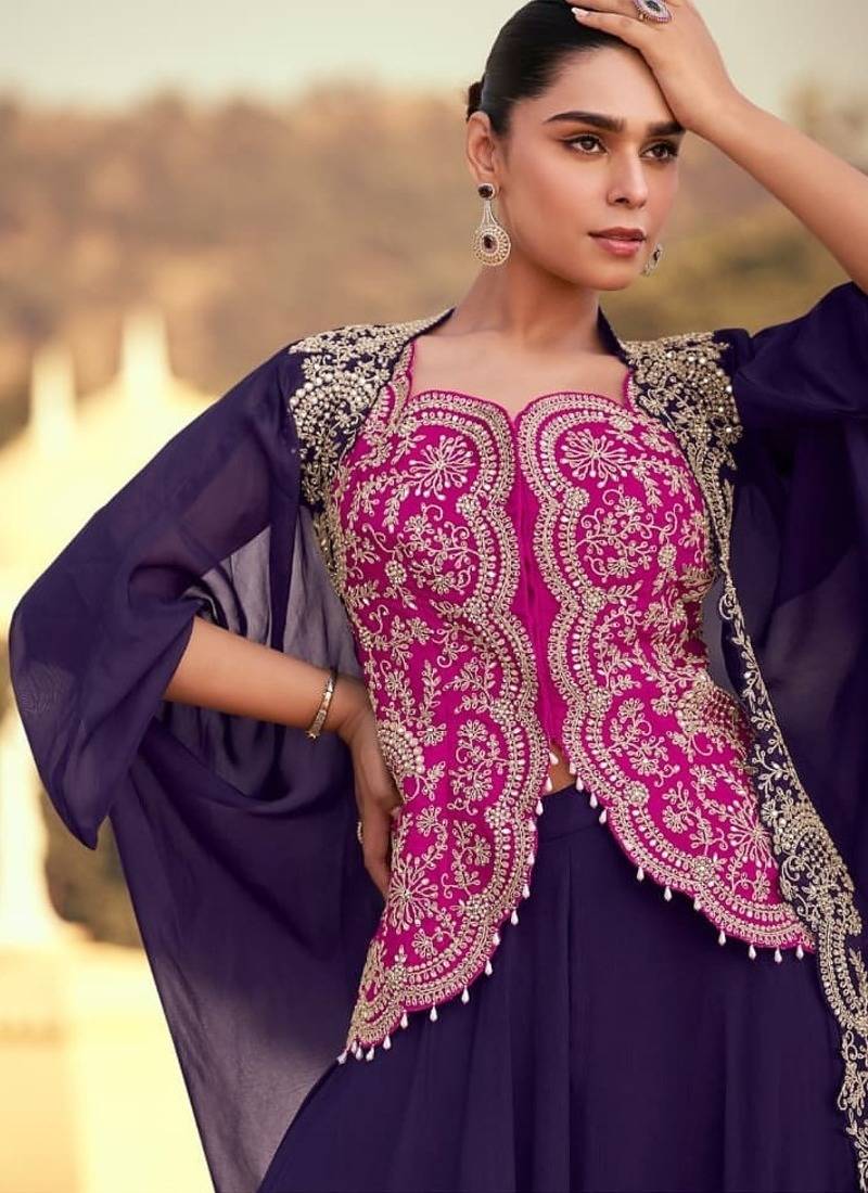 | Product Name | Pink And Blue Wedding Silk Indowestern Top With Palazzo Suits Full Stitched Free Size | |