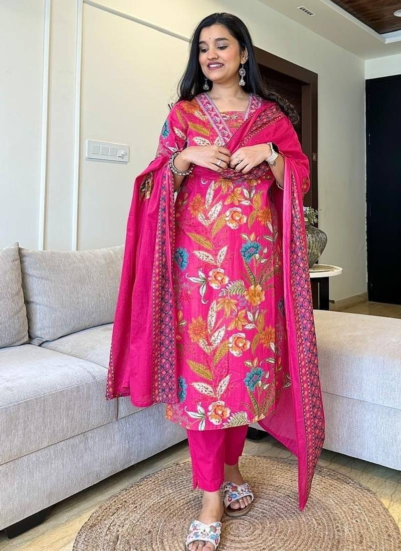 Aaysa women pure cotton embroidered pink kurta with pant and dupatta