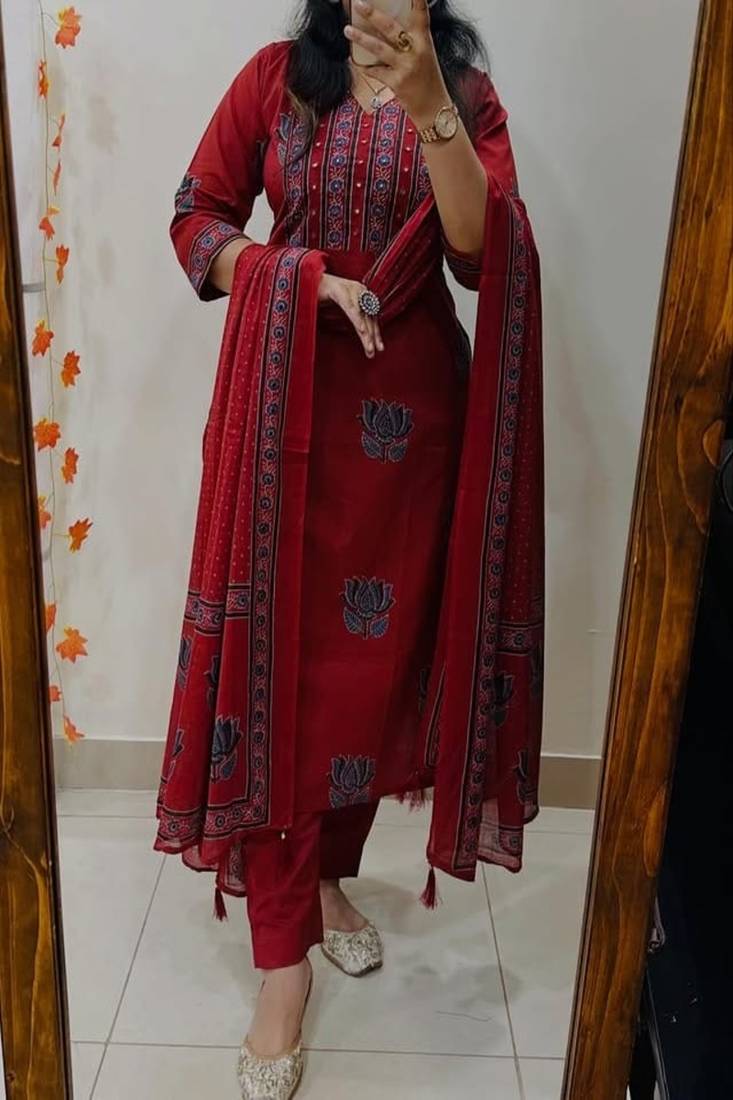 Floral embroidered pure cotton v neck red kurta trouser & dupatta set