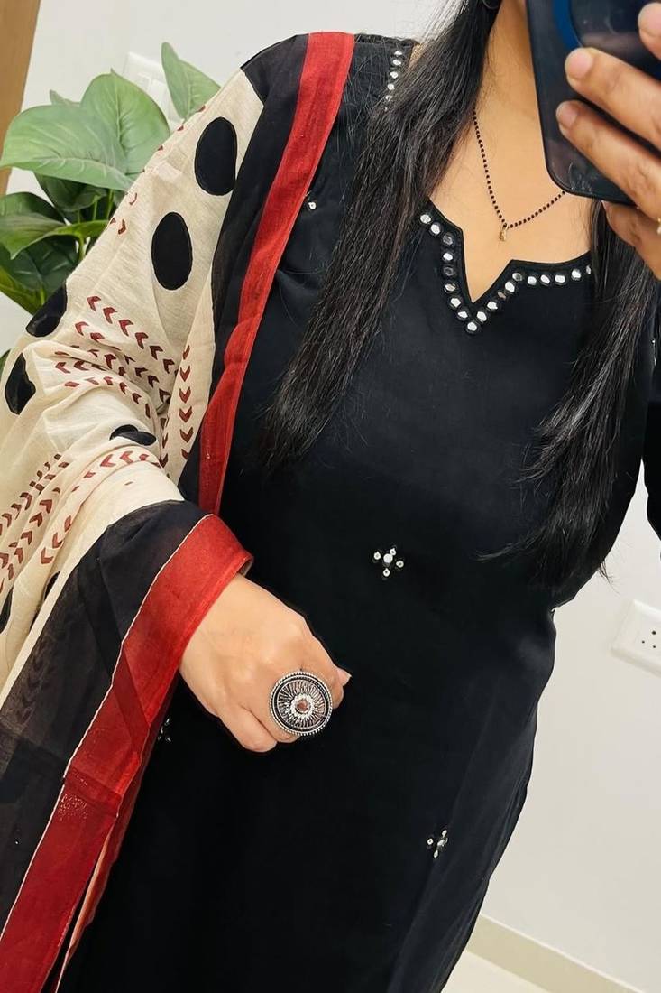 | Product Description | Upgrade Your Ethnic Wardrobe With This Elegant Floral Embroidered U Neck Pure Cotton Kurta, Trouser & Dupatta Set, Designed To Deliver Both Comfort And Timeless Style. Made From 100% Pure Cotton Fabric, This Breathable And Skin Friendly Three Piece Suit Set Ensures All Day Comfort, Making It Ideal For Office Wear, Casual Outings, Festive Gatherings, And Family Functions. The Beautifully Crafted Floral Embroidery Adds A Graceful And Refined Touch, Enhancing The Traditional Appeal Of The Ensemble. The Flattering U Neck Design Creates A Soft, Feminine Silhouette, While The Coordinated Trousers And Matching Dupatta Complete The Look Effortlessly. Lightweight And Easy To Carry, This Cotton Kurta Set Is Perfect For Warm Weather And Year Round Wear. Whether You're Dressing Up For A Celebration Or Keeping It Elegant For Daily Wear, This Embroidered Cotton Suit Set Offers The Perfect Blend Of Sophistication And Practicality. 100% Pure Cotton Fabric: Soft, Breathable, And Comfortable For Long Hours Of Wear. Elegant Floral Embroidery: Intricate Detailing For A Graceful Ethnic Look. Flattering U Neck Design: Stylish Neckline That Enhances The Overall Silhouette. Complete 3 Piece Ensemble: Includes Kurta, Matching Trousers, And Dupatta. Versatile Occasion Wear: Perfect For Office, Festive Events, Casual Gatherings, And Daily Wear. |