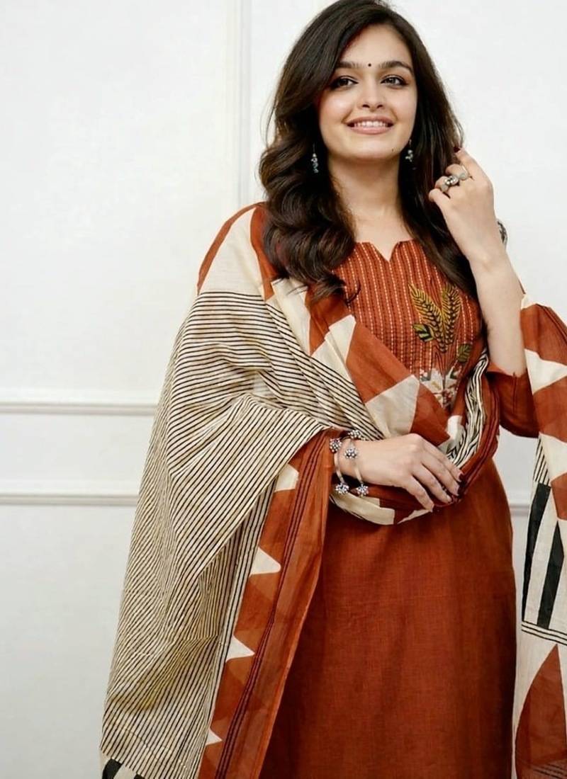 | Product Description | Upgrade Your Ethnic Wardrobe With This Elegant Floral Embroidered U Neck Pure Cotton Kurta, Trouser & Dupatta Set, Designed To Deliver Both Comfort And Timeless Style. Made From 100% Pure Cotton Fabric, This Breathable And Skin Friendly Three Piece Suit Set Ensures All Day Comfort, Making It Ideal For Office Wear, Casual Outings, Festive Gatherings, And Family Functions. The Beautifully Crafted Floral Embroidery Adds A Graceful And Refined Touch, Enhancing The Traditional Appeal Of The Ensemble. The Flattering U Neck Design Creates A Soft, Feminine Silhouette, While The Coordinated Trousers And Matching Dupatta Complete The Look Effortlessly. Lightweight And Easy To Carry, This Cotton Kurta Set Is Perfect For Warm Weather And Year Round Wear. Whether You're Dressing Up For A Celebration Or Keeping It Elegant For Daily Wear, This Embroidered Cotton Suit Set Offers The Perfect Blend Of Sophistication And Practicality. 100% Pure Cotton Fabric: Soft, Breathable, And Comfortable For Long Hours Of Wear. Elegant Floral Embroidery: Intricate Detailing For A Graceful Ethnic Look. Flattering U Neck Design: Stylish Neckline That Enhances The Overall Silhouette. Complete 3 Piece Ensemble: Includes Kurta, Matching Trousers, And Dupatta. Versatile Occasion Wear: Perfect For Office, Festive Events, Casual Gatherings, And Daily Wear. |