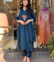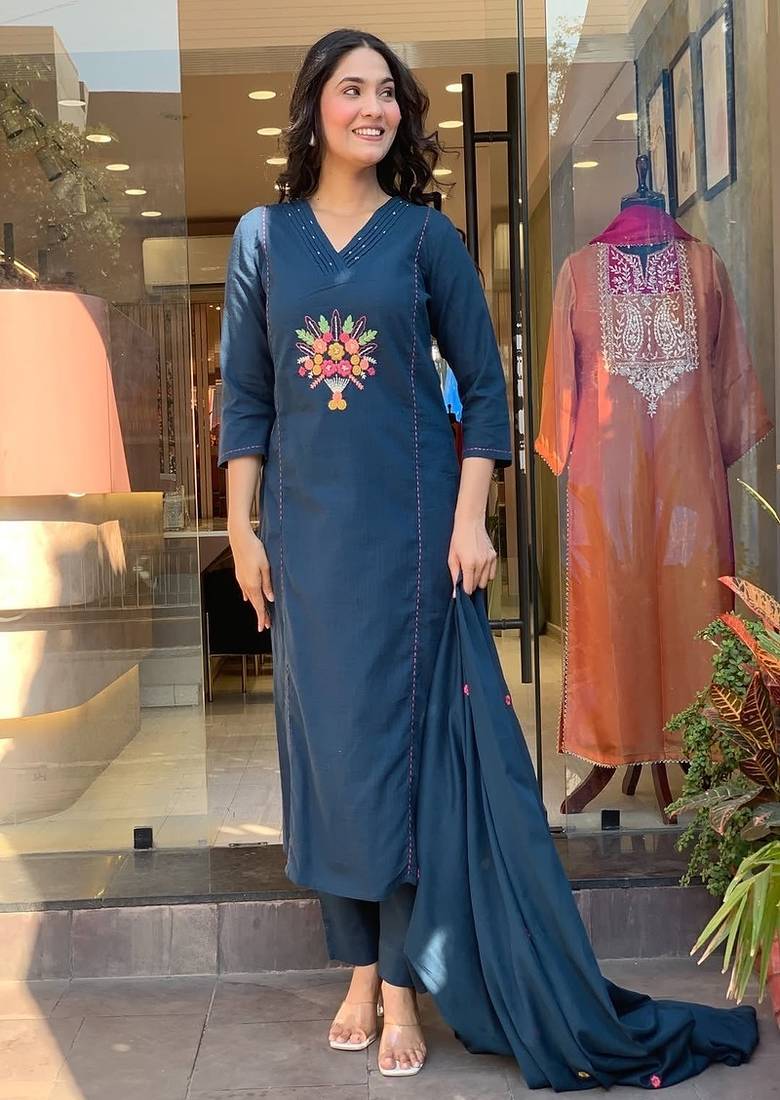Blue floral embroidered cotton kurta with trouser and dupatta