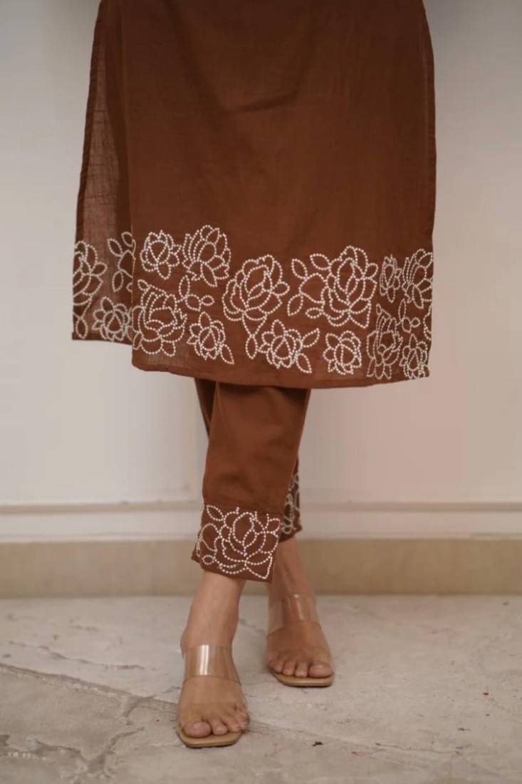 Brown floral embroidered cotton kurta with trouser