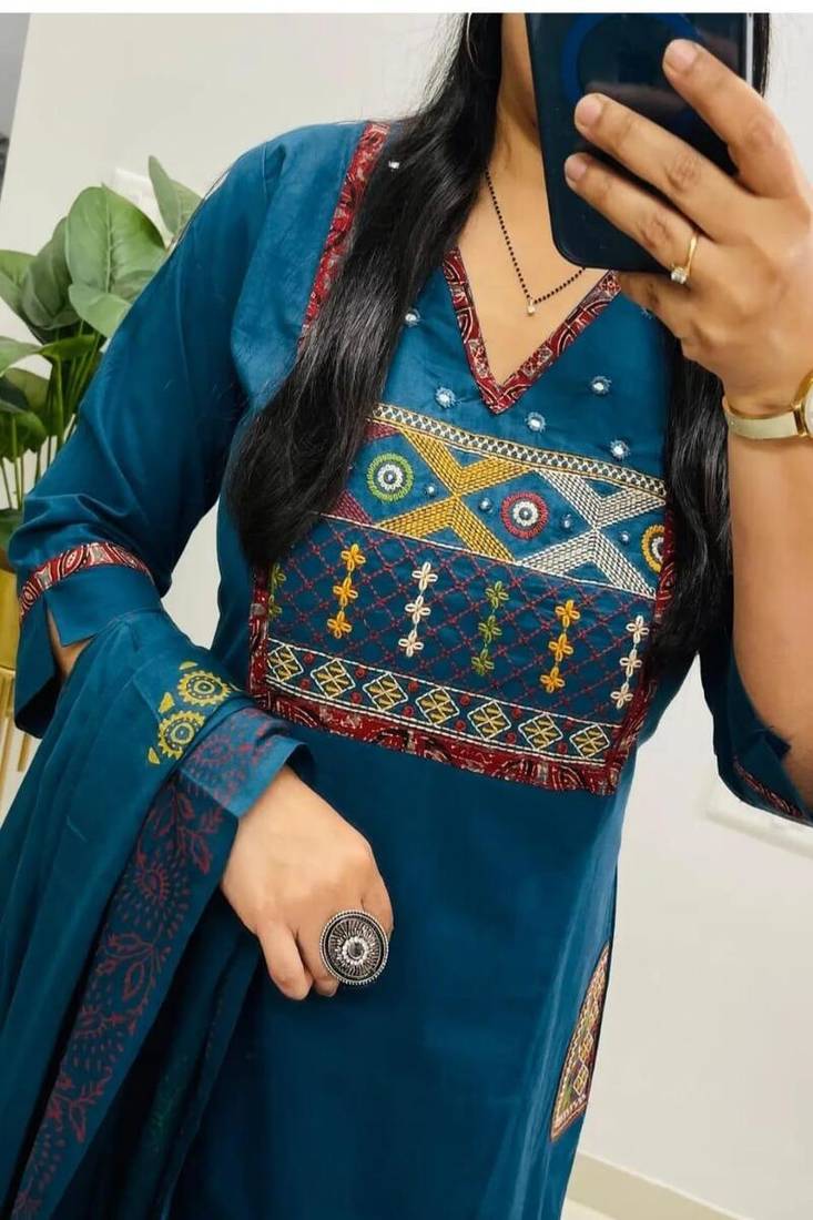 | Product Description | Refresh Your Ethnic Wardrobe With This Elegant Floral Embroidered V Neck Pure Cotton Kurta, Trouser & Dupatta Set, Thoughtfully Designed For Comfort, Style, And Everyday Sophistication. Crafted From 100% Pure Cotton Fabric, This Breathable And Lightweight Three Piece Suit Set Ensures Superior Comfort, Making It Perfect For Office Wear, Festive Gatherings, Casual Outings, And Family Celebrations. The Kurta Features Delicate Floral Embroidery That Enhances Its Traditional Charm, While The Flattering V Neck Design Adds A Modern And Elongating Touch To The Silhouette. Paired With Matching Cotton Trousers And A Beautifully Coordinated Dupatta, This Set Offers A Complete, Ready To Wear Ethnic Ensemble That Blends Elegance With Practicality. Soft On The Skin And Easy To Maintain, This Embroidered Cotton Suit Set Is Ideal For Warm Weather And All Day Wear. Style It With Statement Earrings And Classic Footwear For A Refined And Graceful Look. Premium Pure Cotton Fabric: Breathable, Soft, And Skin Friendly For Lasting Comfort. Elegant Floral Embroidery: Intricate Threadwork Adds Timeless Ethnic Appeal. Stylish V Neck Design: Flattering Neckline That Enhances The Overall Silhouette. Complete 3 Piece Set: Includes Embroidered Kurta, Matching Trousers, And Dupatta. Perfect For Multiple Occasions: Ideal For Office Wear, Festive Events, Casual Gatherings, And Daily Styling. |
