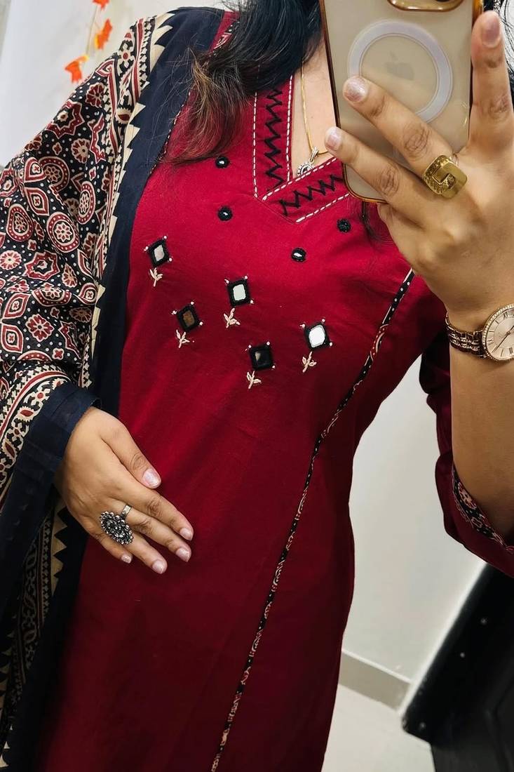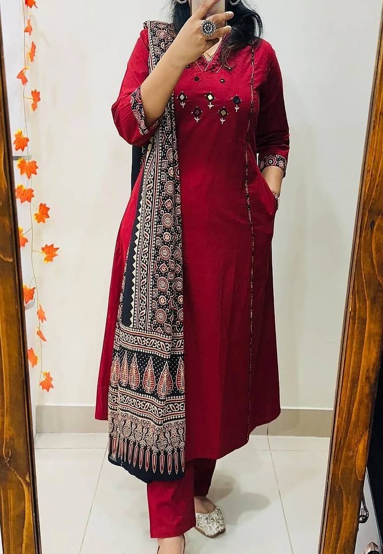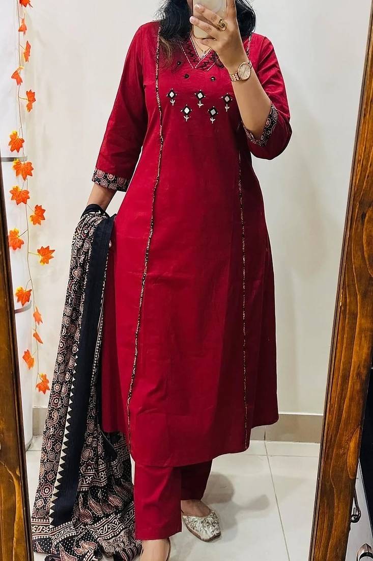 | Product Description | Refresh Your Ethnic Wardrobe With This Elegant Floral Embroidered V Neck Pure Cotton Kurta, Trouser & Dupatta Set, Thoughtfully Designed For Comfort, Style, And Everyday Sophistication. Crafted From 100% Pure Cotton Fabric, This Breathable And Lightweight Three Piece Suit Set Ensures Superior Comfort, Making It Perfect For Office Wear, Festive Gatherings, Casual Outings, And Family Celebrations. The Kurta Features Delicate Floral Embroidery That Enhances Its Traditional Charm, While The Flattering V Neck Design Adds A Modern And Elongating Touch To The Silhouette. Paired With Matching Cotton Trousers And A Beautifully Coordinated Dupatta, This Set Offers A Complete, Ready To Wear Ethnic Ensemble That Blends Elegance With Practicality. Soft On The Skin And Easy To Maintain, This Embroidered Cotton Suit Set Is Ideal For Warm Weather And All Day Wear. Style It With Statement Earrings And Classic Footwear For A Refined And Graceful Look. Premium Pure Cotton Fabric: Breathable, Soft, And Skin Friendly For Lasting Comfort. Elegant Floral Embroidery: Intricate Threadwork Adds Timeless Ethnic Appeal. Stylish V Neck Design: Flattering Neckline That Enhances The Overall Silhouette. Complete 3 Piece Set: Includes Embroidered Kurta, Matching Trousers, And Dupatta. Perfect For Multiple Occasions: Ideal For Office Wear, Festive Events, Casual Gatherings, And Daily Styling. |