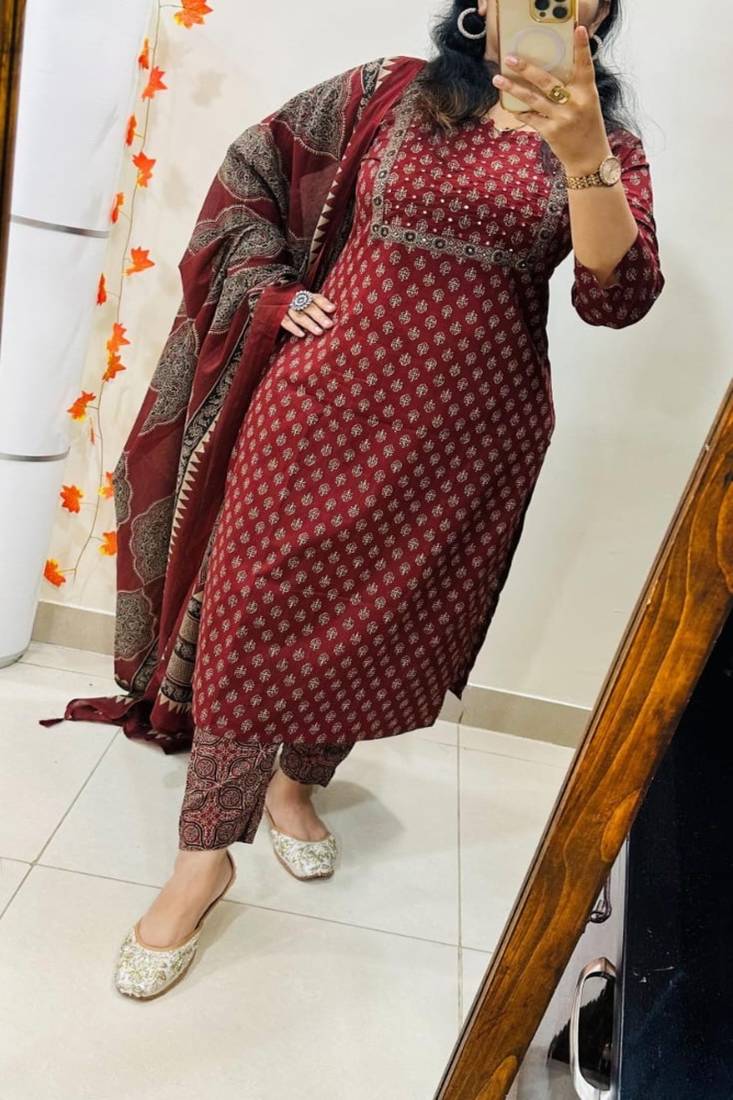 | Product Description | Upgrade Your Ethnic Wardrobe With This Elegant Floral Printed Round Neck Pure Cotton Kurta Trouser & Dupatta Set, Designed For Everyday Comfort And Timeless Style. Crafted From Premium Pure Cotton Fabric, This Kurta Set Feels Soft On The Skin And Offers Excellent Breathability, Making It Ideal For All Day Wear. The Classic Round Neck Kurta Is Adorned With A Refreshing Floral Print That Adds A Graceful And Feminine Charm. Paired With A Comfortable Cotton Trouser And A Lightweight Matching Dupatta, This 3 Piece Set Is Perfect For Daily Wear, Office Wear, Festive Gatherings, And Casual Outings. Style It With Minimal Accessories For A Refined Ethnic Look. ✨ Key Features (Bullet Points) Premium Pure Cotton Fabric – Soft, Breathable, And Comfortable For All Day Wear Floral Printed Design – Elegant And Vibrant Print For A Fresh Ethnic Appeal Classic Round Neck Kurta – Timeless Neckline Suitable For Every Body Type Complete 3 Piece Set – Kurta, Trouser, And Matching Dupatta Included Versatile Occasion Wear – Ideal For Daily Wear, Office, Casual Outings, And Festive Occasions |