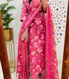 Pink printed round neck pure cotton kurta trouser dupatta set