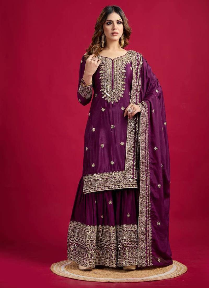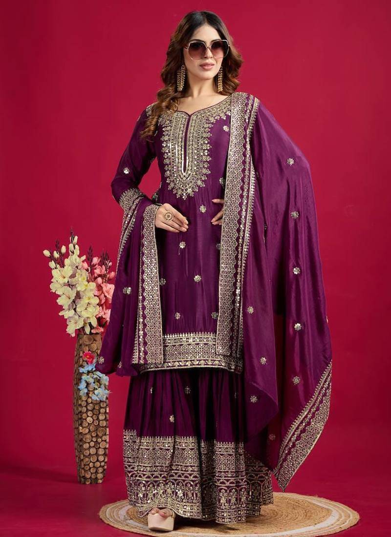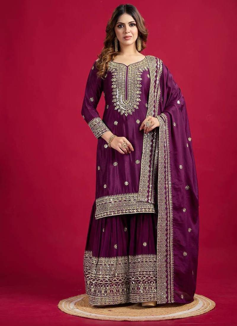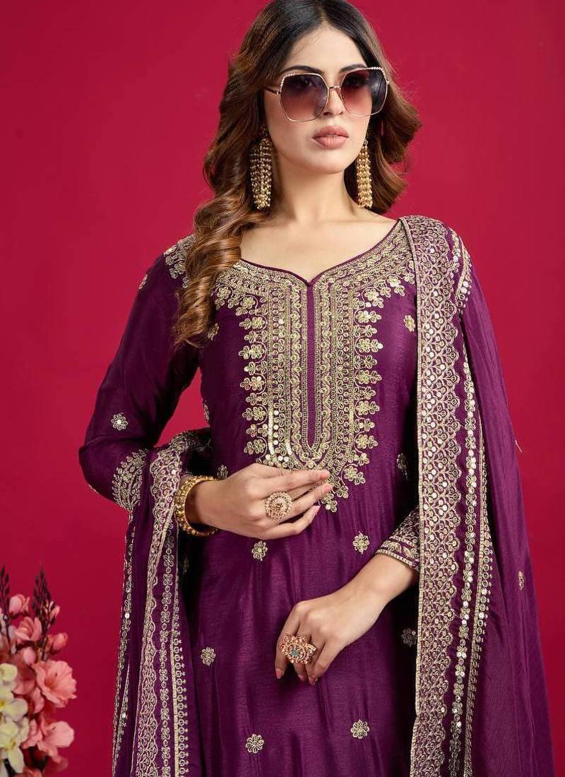 Chinnon silk embroidery sequence work top-plazo and dupatta set stitched