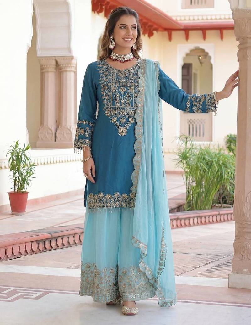 | • | Kameez | : | Color- Sky Blue / Fabric- Chiffon |