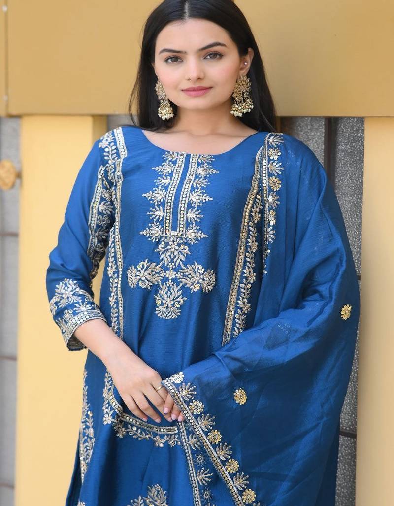 Designer chinon suit with sequence embroidered work stitched